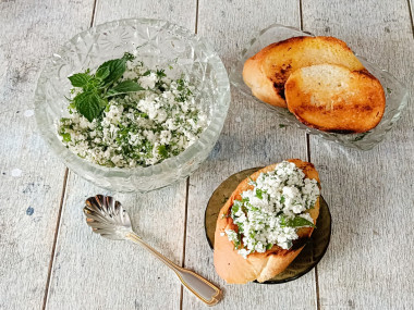 Намазка готова, подсушила ломтики батона на сковороде, намазала творожной массой и можно завтракать.