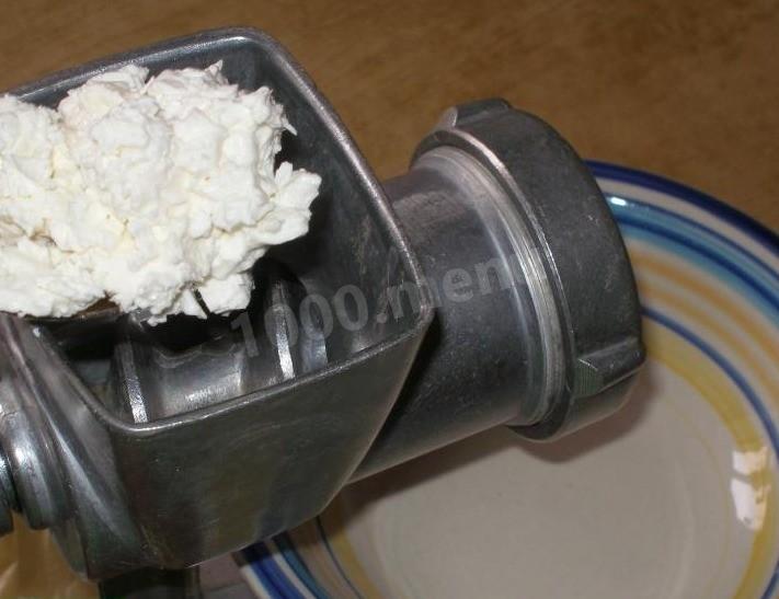 Пропустите творог через мясорубку через мелкую сеточку. Также можно пробить творог блендером или в кухонном комбайне.