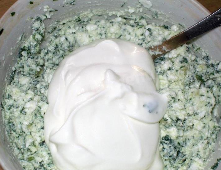Добавьте сметану. Сметану при желании можно заменить на майонез.