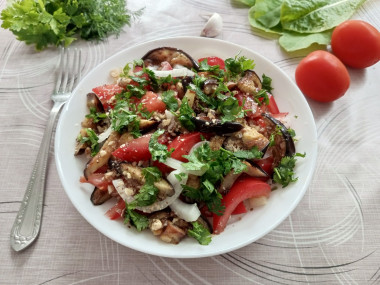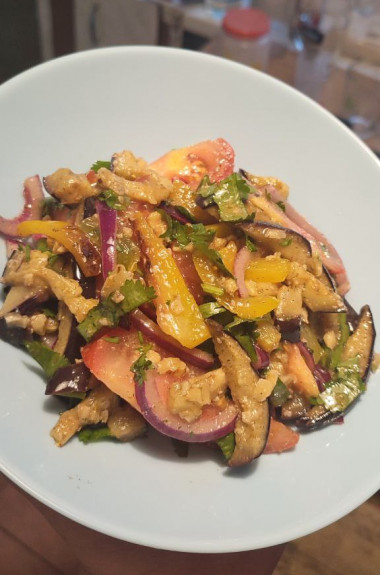 Очень интересный и вкусный салат, единственный минус, что довольно масленый, так как баклажан впитывает буквально всё масло, на котором его обжариваешь)
