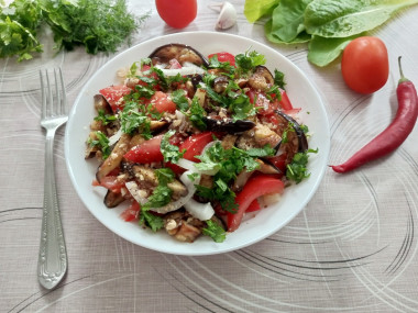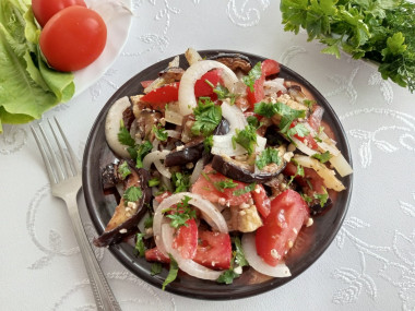 Какой же это вкусный салат! Обожаю блюда с баклажанами. Они хороши в любом виде. А в этом грузинском салате с баклажанами и помидорами прекрасно сочетаются жареные и свежие овощи. Маринованный лучок, орехи и чеснок придают салату особую пикантность. Зелень базилика прекрасно дополняет этот вскуснейший салат. Правда,