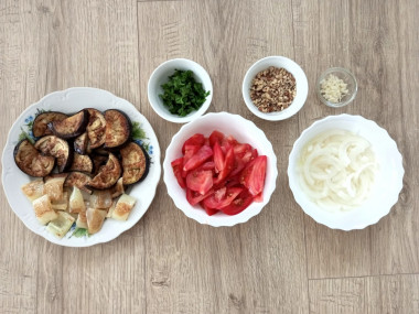 Как сделать грузинский салат с баклажанами помидорами и кинзой? Подготовьте продукты. Помидоры вы можете взять как крупные, так и маленькие черри. Лук — любой репчатый, у меня фиолетовый. Если вы не любите кинзу, то замените ее петрушкой или базиликом. Все овощи и зелень помойте и обсушите.