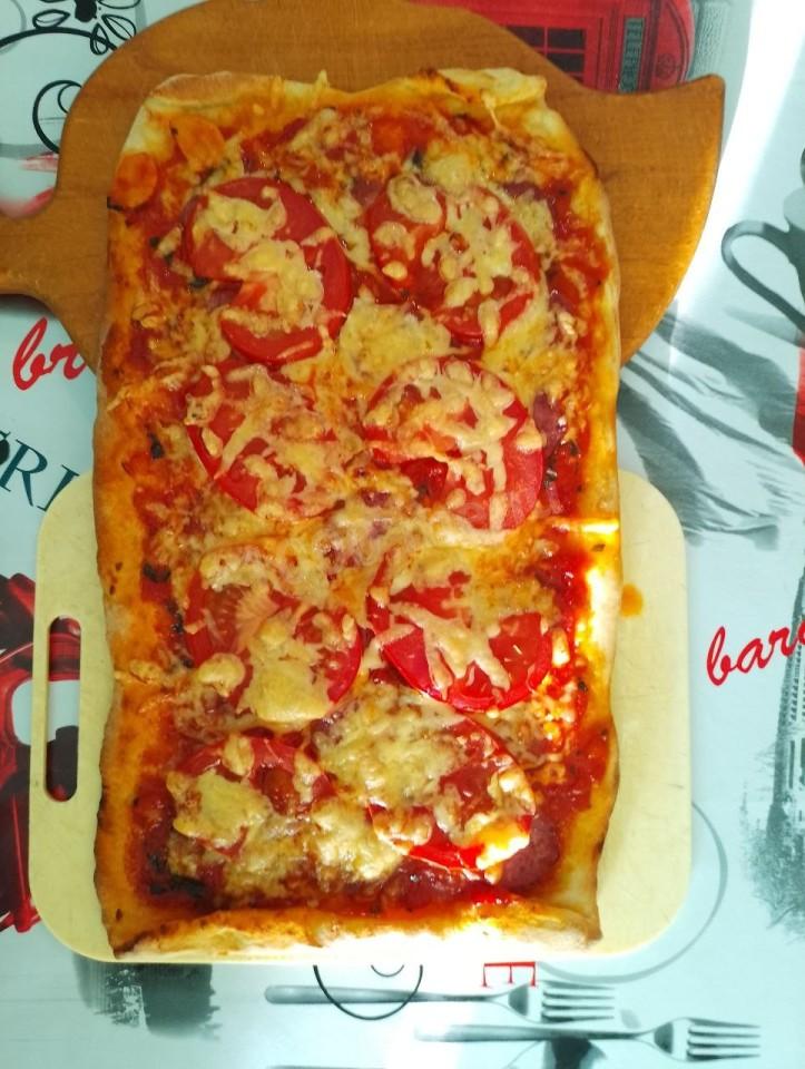 - Посыпьте часть сыра, затем выложите колбасу, помидоры и снова немного сыра сверху.