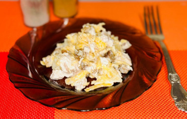 Смотрите здесь интересные рецепты домашнего майонеза. Так же в качестве заправки можно использовать не только майонез, но и сметану или натуральный йогурт. Их можно взять по отдельности либо смешать с майонезом в любой пропорции на свой вкус - это снизит калорийность блюда.