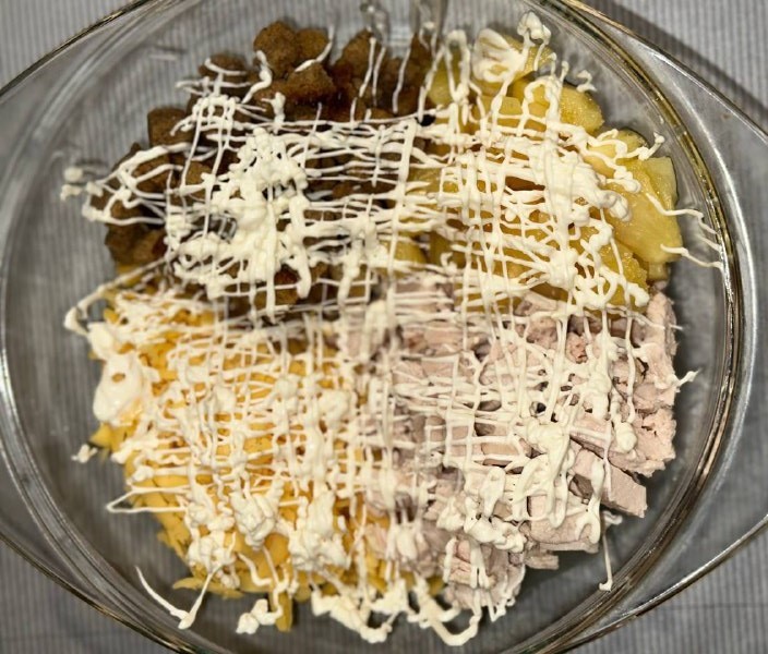 Подавайте салат Дамский каприз к столу. Приятного аппетита!
