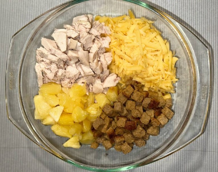 Далее повторите слои в обратном порядке — на ананасы положите куриное филе, а на него — натертый сыр.