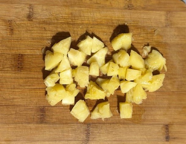 Также на кубики нарежьте кусочки ананаса.