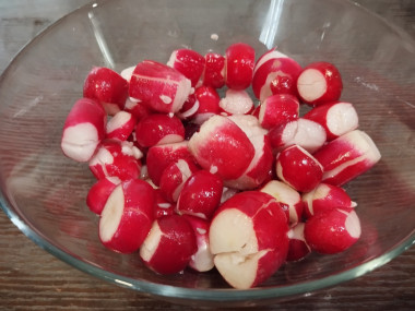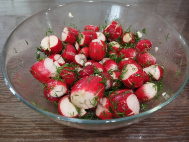 Затяните миску с редиской пищевой пленкой и уберите в холодильник минимум на 30 минут.