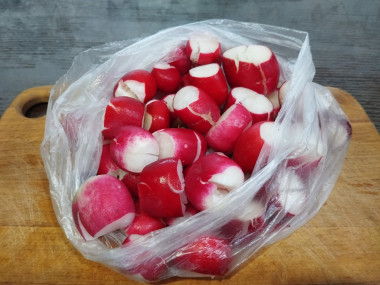 Сложите редиску в плотный пакет, положите пакет на доску. Скалкой разбейте каждую редисину — она должна треснуть, но при этом не развалиться. Если у вас возникли трудности с разбиванием, то сделайте острым ножом на каждой редиске крестообразные надрезы.