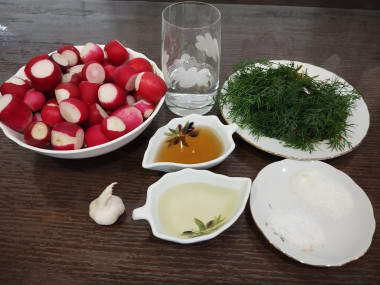 Как сделать маринованную битую редиску? Подготовьте продукты. Редиску возьмите по возможности молоденькую, весеннюю, хотя и из зимней закуска получится вкусной. Но особо хороша она будет весной. Количество перца регулируйте по своему вкусу. Масло вы можете взять и обычное подсолнечное. Вместо яблочного уксуса подойдет столовый 9% или сок лимона.