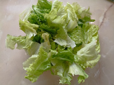 Капусту (или салат) нарежьте сначала на полоски, а затем на квадратики. Сложите овощи в салатник.