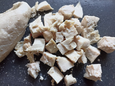Куриное мясо немного остудите, а затем нарежьте также крупными кубиками.