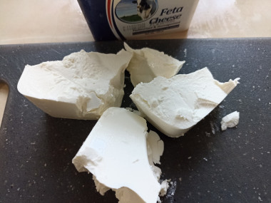 Выложите в салатник мягкий сыр. Если его невозможно нарезать, то кладите сыр ложкой.