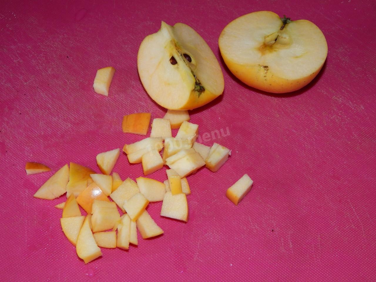 Яблоки лучше возьмите кисло-сладкого сорта, они придадут салату приятные вкусовые нотки. Если у яблок жесткая кожица, снимите ее, семенную коробочку также удалите. Мякоть нарежьте кубиками или соломкой. Чтобы яблоко не потемнело, можете сбрызнуть его лимонным соком.