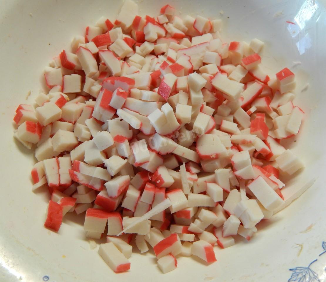 Консервированную кукурузу откиньте на дуршлаг, чтобы маринад полностью стек. Лишняя жидкость в салате не нужна. Размороженные крабовые палочки извлеките из упаковки, снимите с них плёнку. Пленка, в которую завернута каждая крабовая палочка, иногда плохо снимается. Чтобы облегчить процесс, подержите палочки над паром в течение 1-3 секунд. Крабовые палочки нарежьте ножом маленькими кубиками.