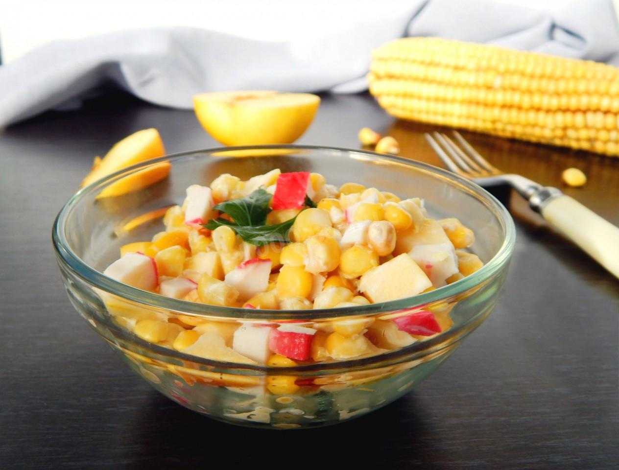 Как сделать салат с крабовыми палочками, яблоком и кукурузой? Подготовьте продукты. Для этого салата нужно минимум ингредиентов. По желанию репчатый лук можете заменить зеленым луком или не добавлять вообще, для остроты к майонезу можно добавить измельченный чеснок.