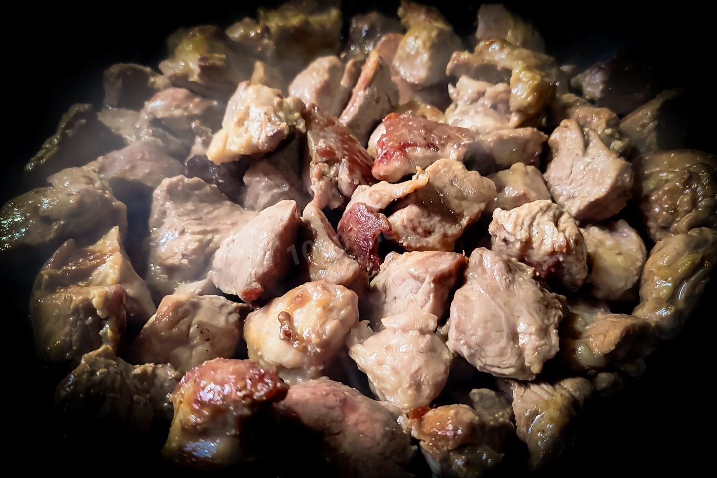 Когда мясо начнёт с лёгкостью отходить от сковороды, то аккуратно лопаткой перевернуть его и обжаривать до золотистой корочки со всех сторон всё так же на сильном огне. Когда мясо везде поджарится, то его нужно вынуть в отдельную посуду.
