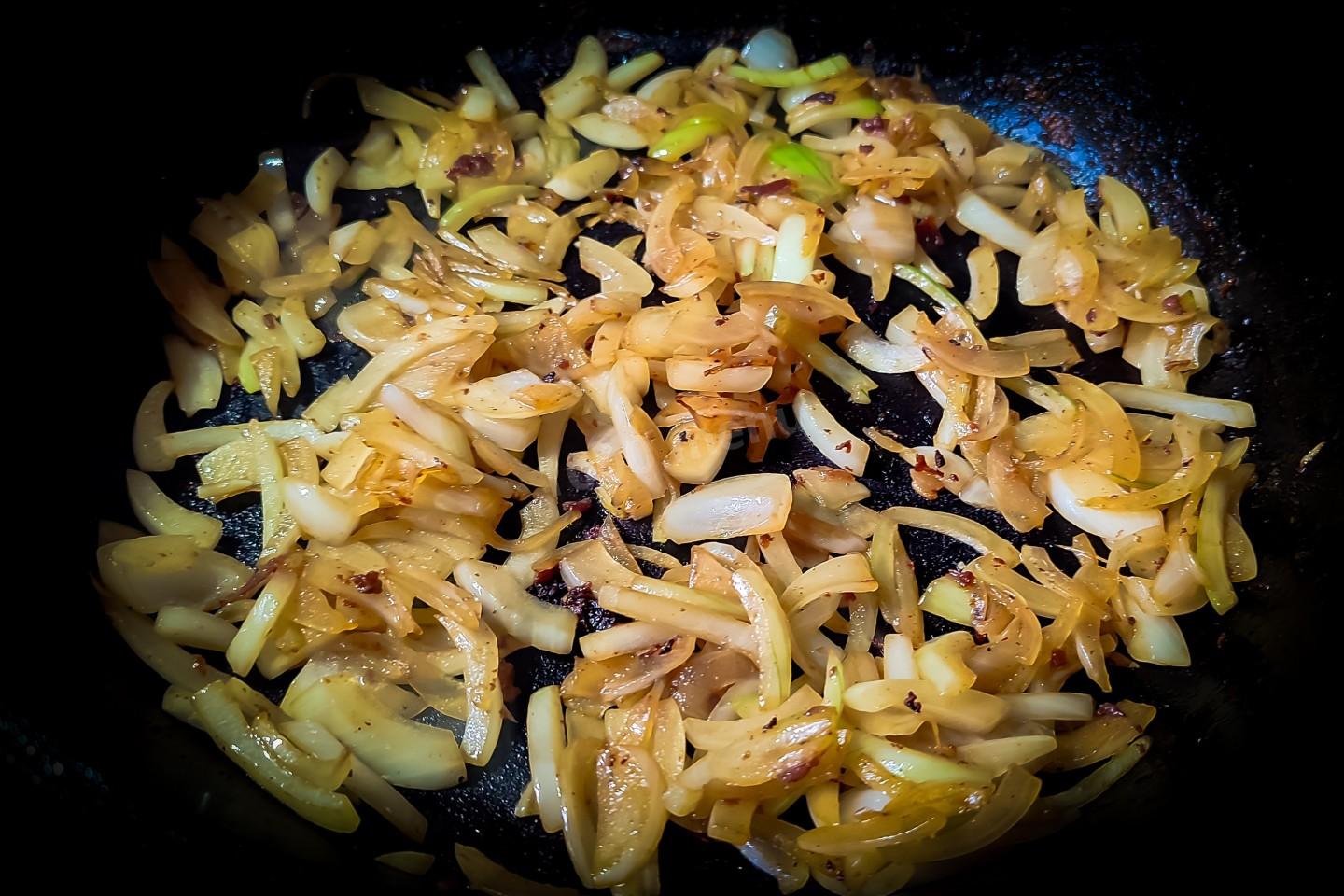 В опустевшую сковороду всыпать мелконарезанный репчатый лук. И также на сильном огне обжаривать лук до золотистой корочки.