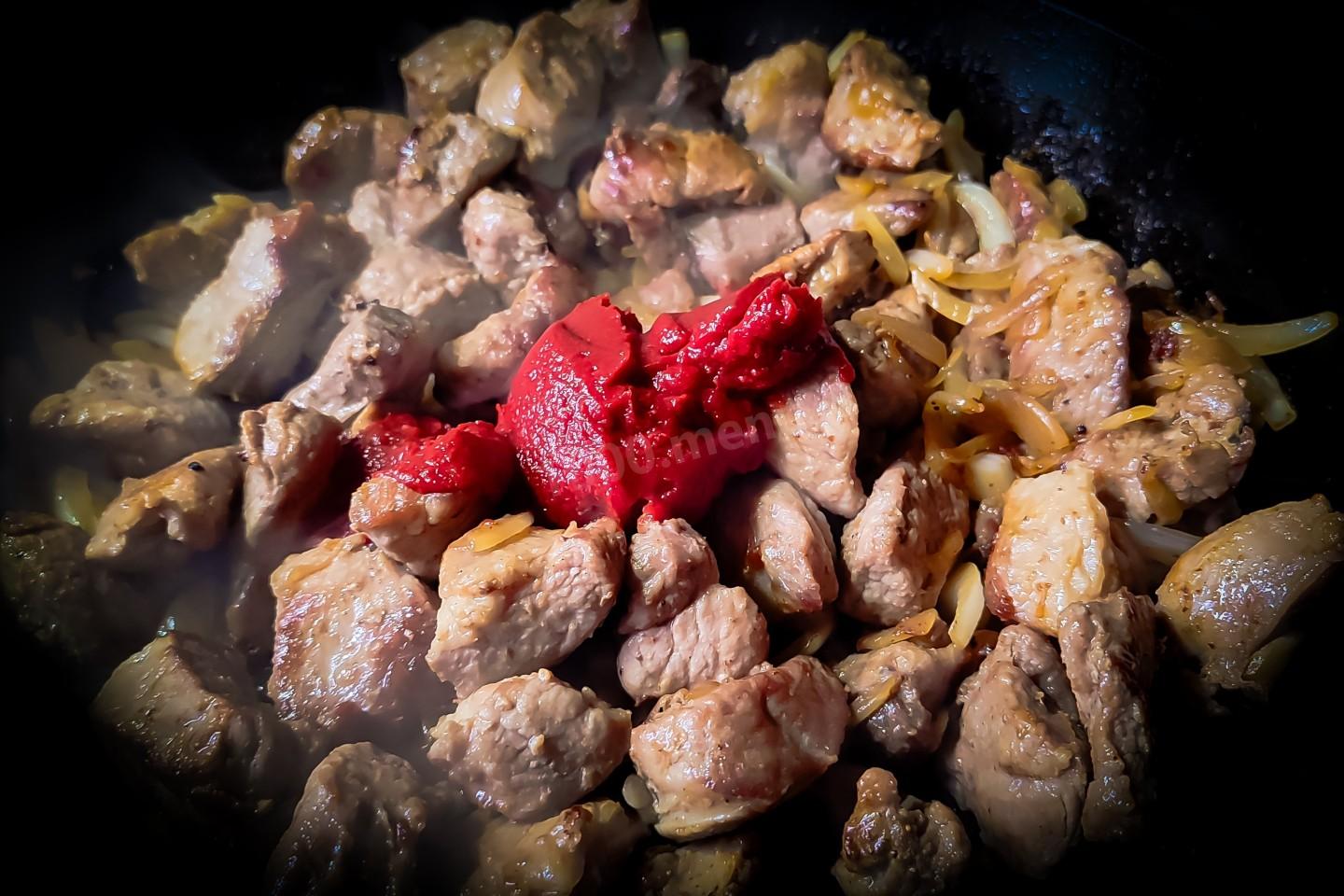 Когда лук станет золотистым и начнёт карамелизироваться, то в сковороду вернуть мясо, обжарить 5 минут периодически перемешивая, выложить томатную пасту, хорошо перемешать.