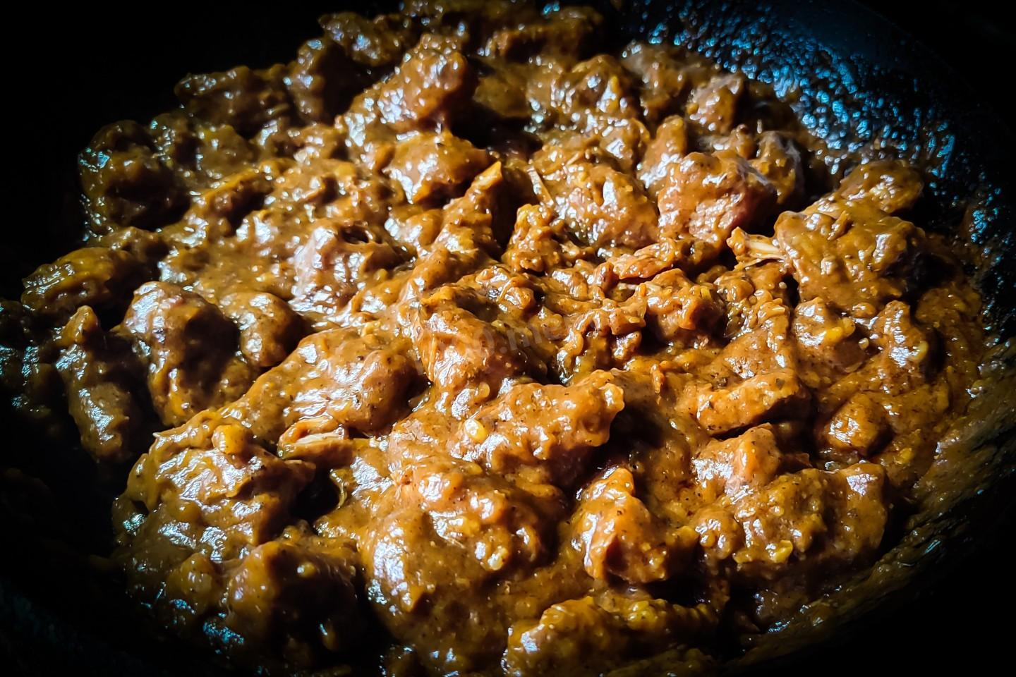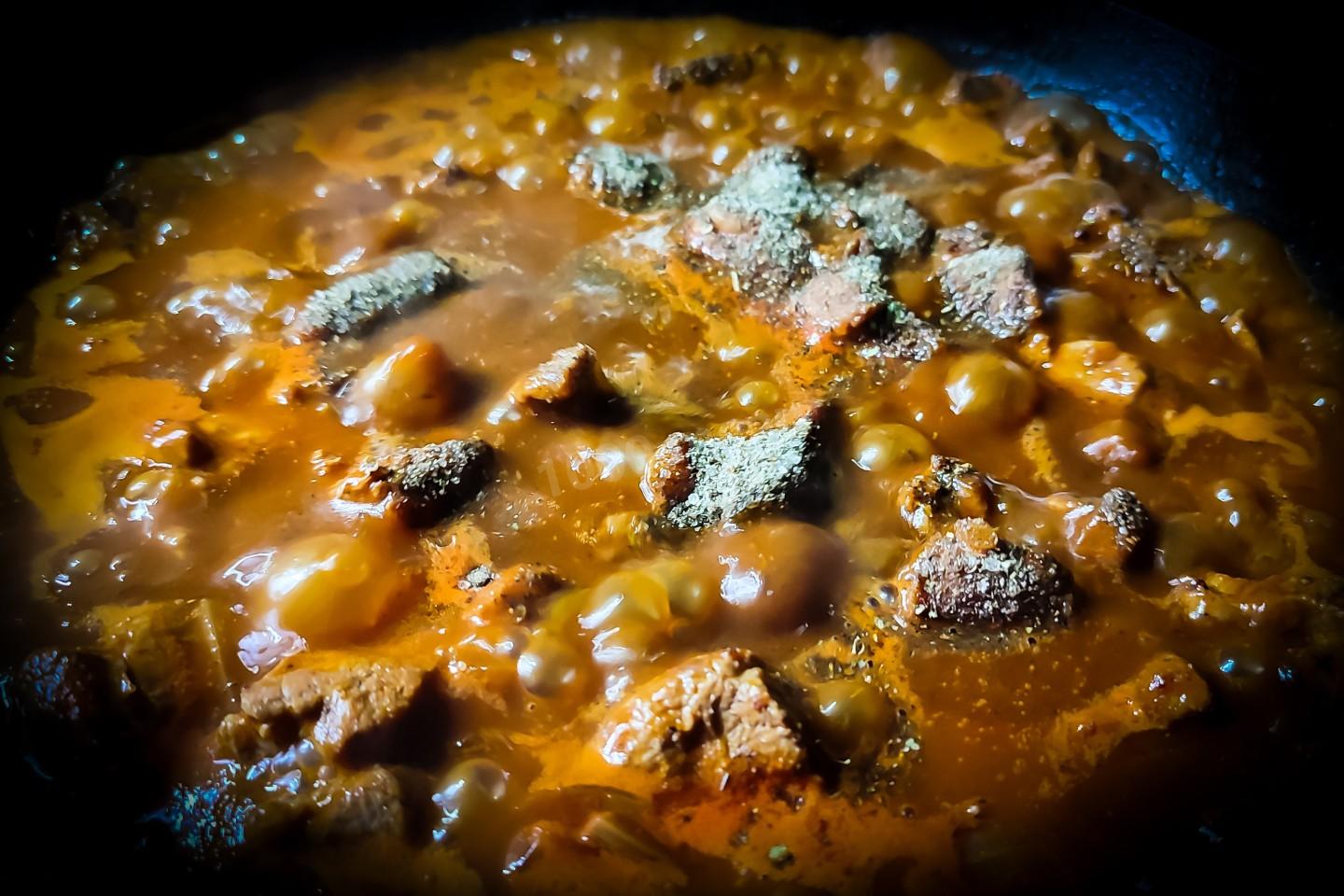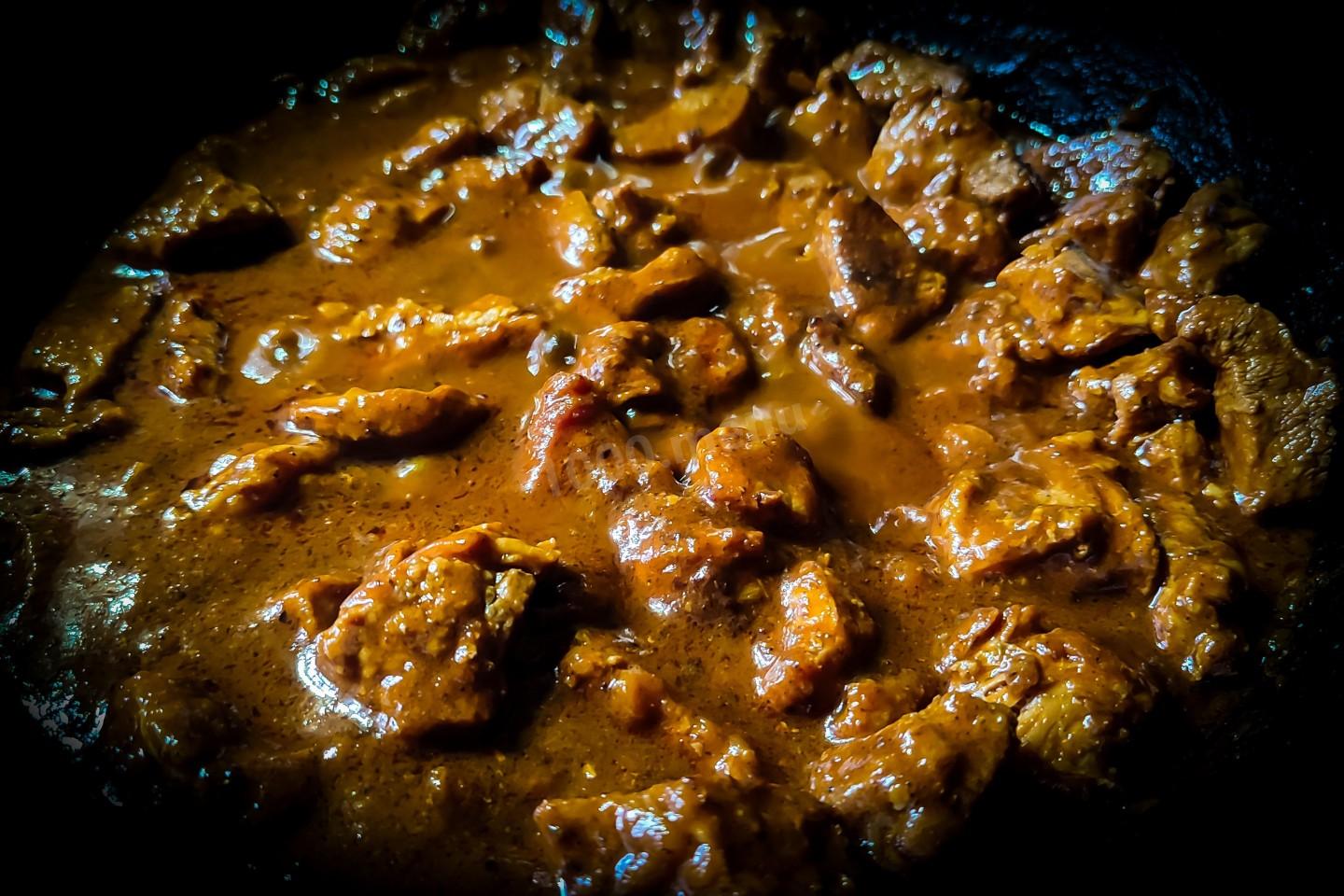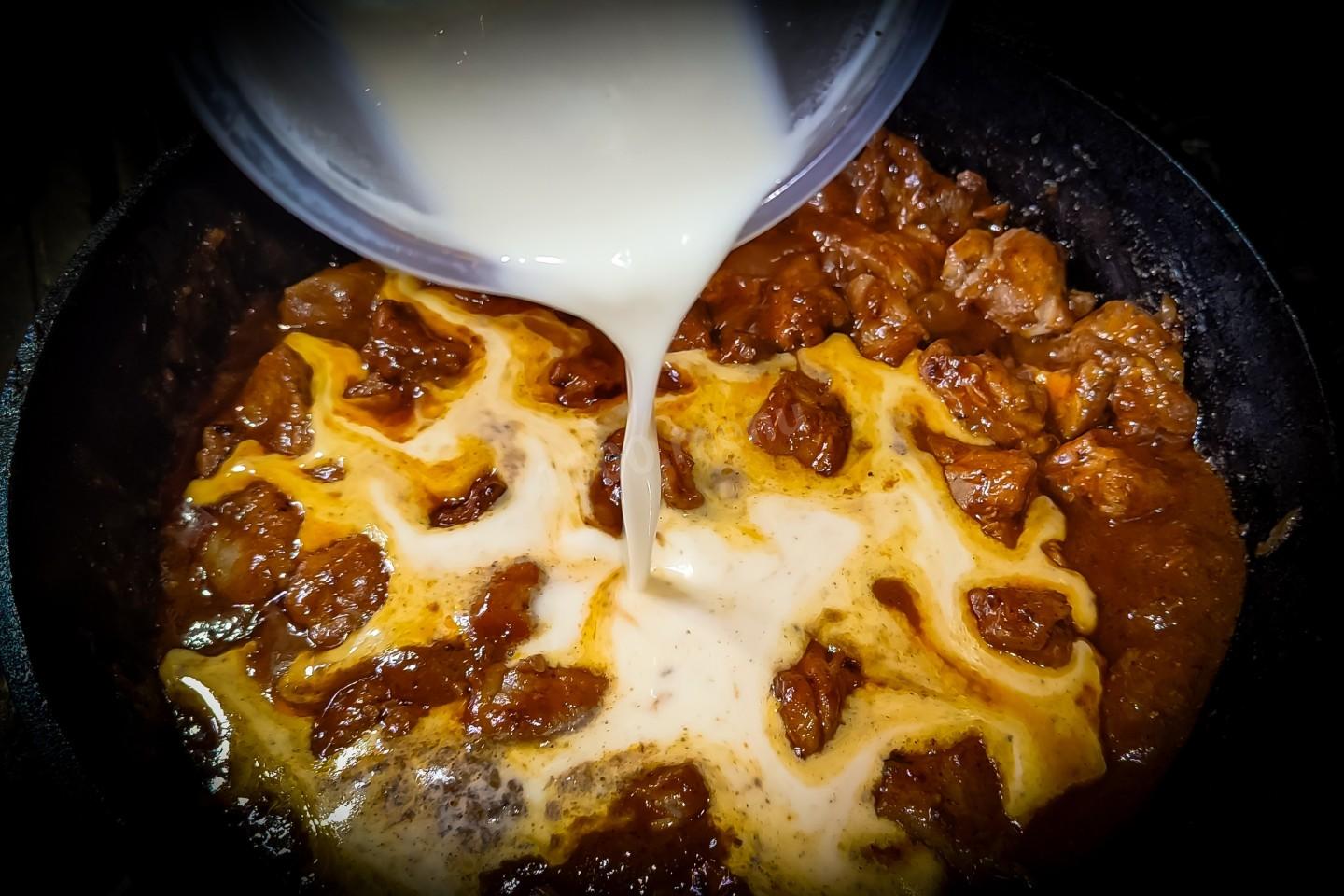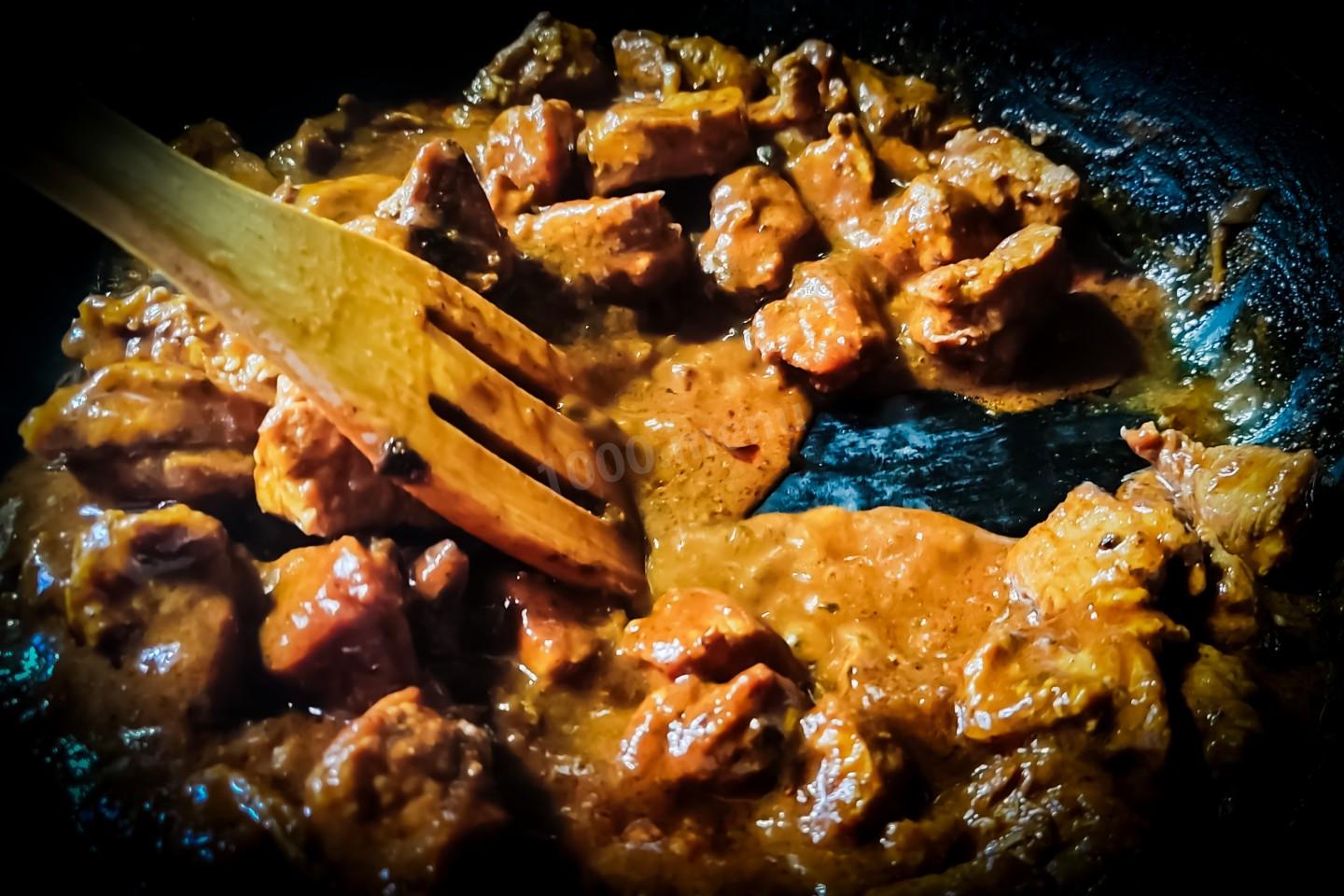 Через 5 минут кипения в сковороду к мясу всыпать сухую смесь, хорошо перемешать.
