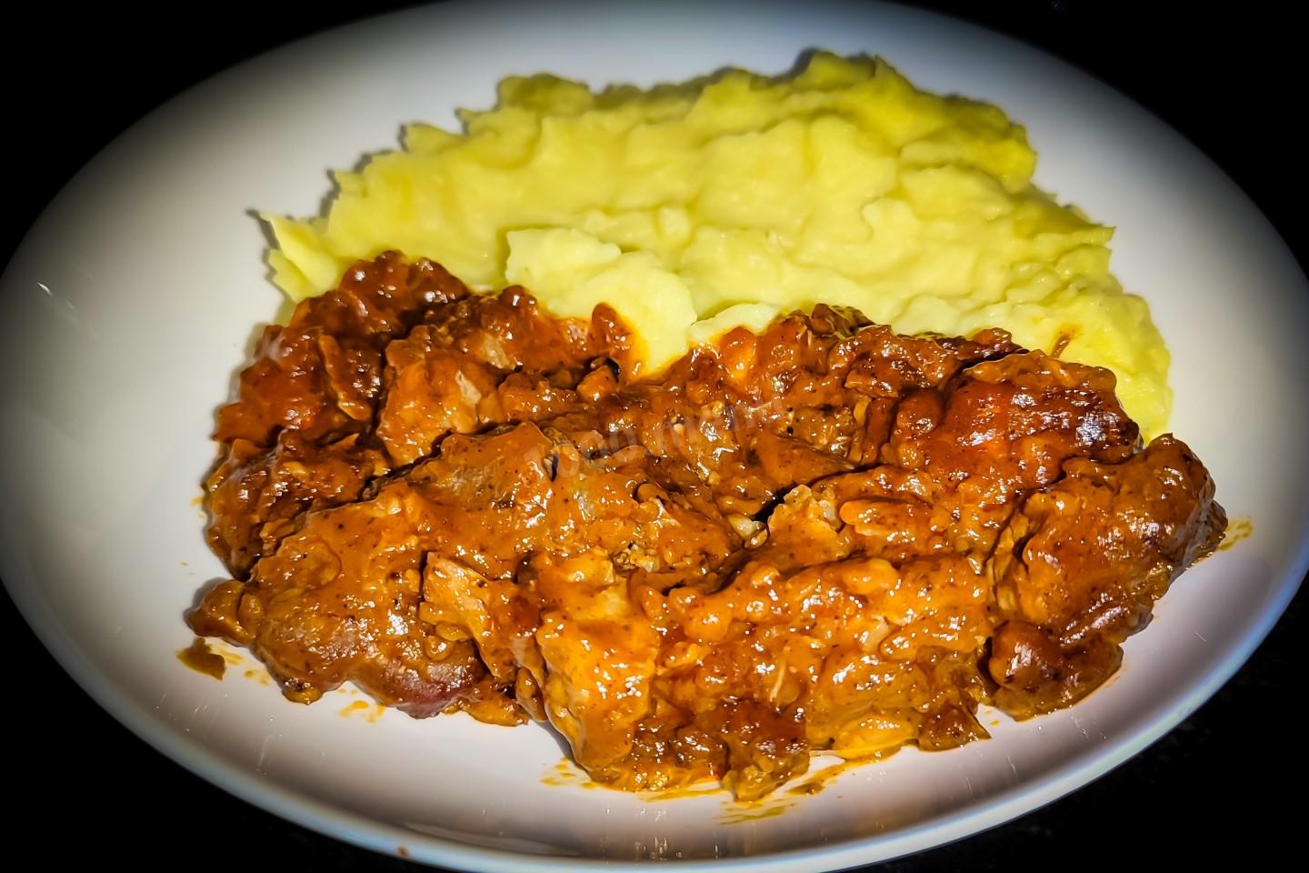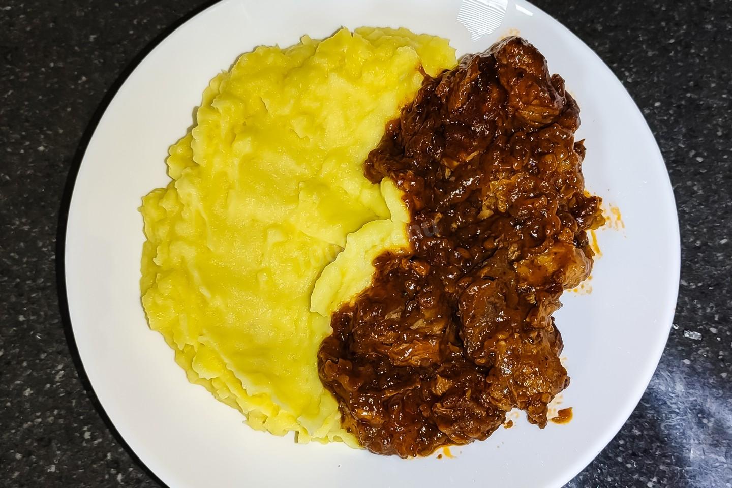 Полученный гуляш прекрасно подходит с картофельному пюре и отварной вермишели.