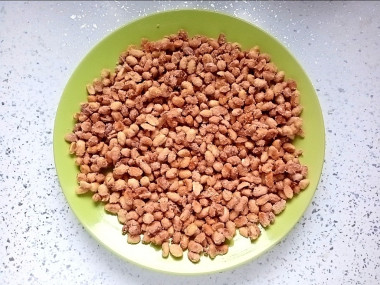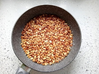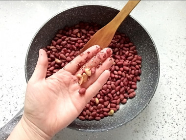 Я начала с нуля, т. е. взяла сырой не очищенный арахис, помыла его и обжарила на маленьком огне. После остывания очистила, шкурка легко снимается руками.