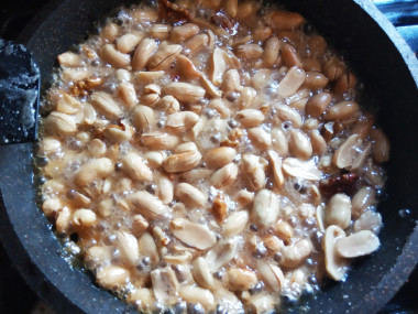 Постепенно сахар начнет коричневеть, орехи обжариваться, а вся масса густеть.