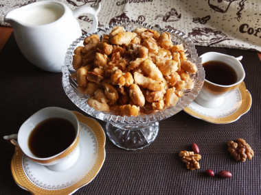 Пока занималась орехами, сахар растворялся в воде. Отмеряла все стаканом объемом 250 мл.