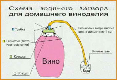 Добрый день! Водяной или гидрозатвор можно купить в специализированных магазинах для домашнего виноделия. Или изготовить самому. Загуглите, в интернете на этот счёт масса полезной информации. Вот приблизительная схема гидрозатвора: