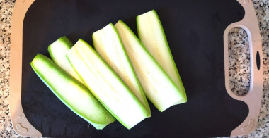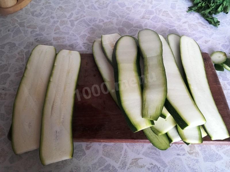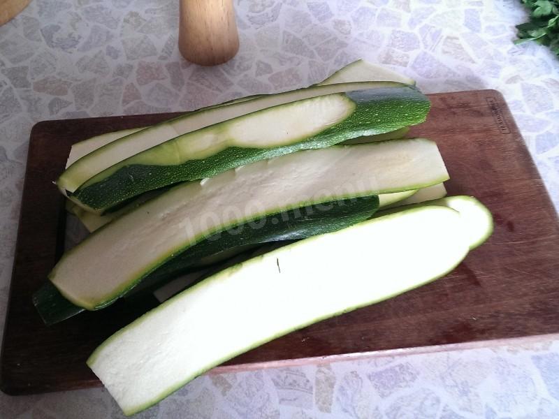Нарежьте кабачки вдоль. Толщина около 5 мм.