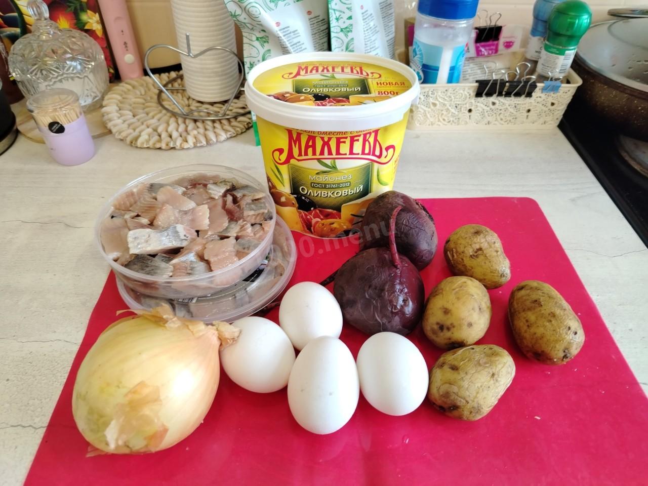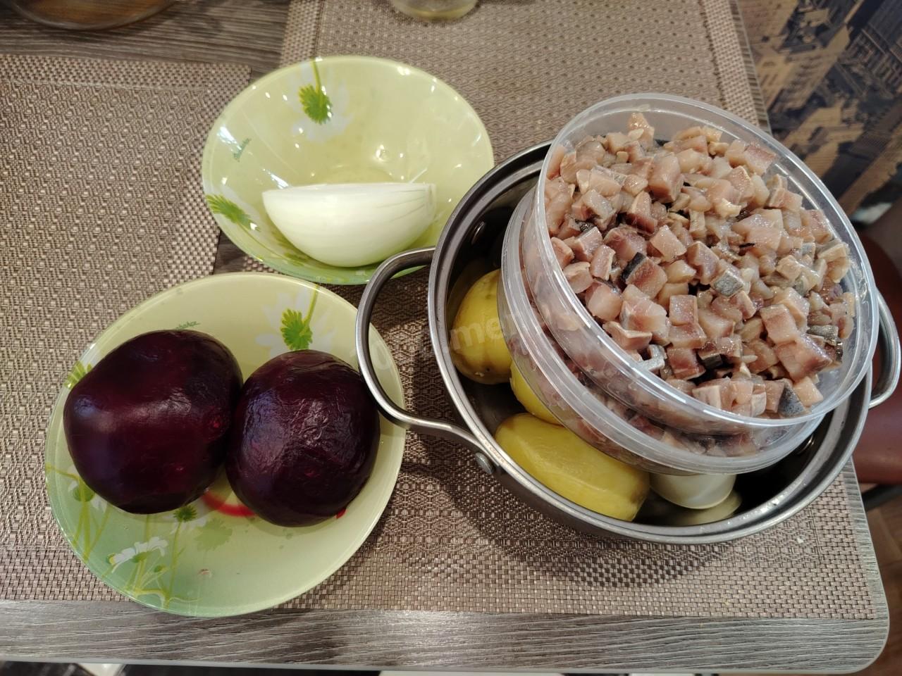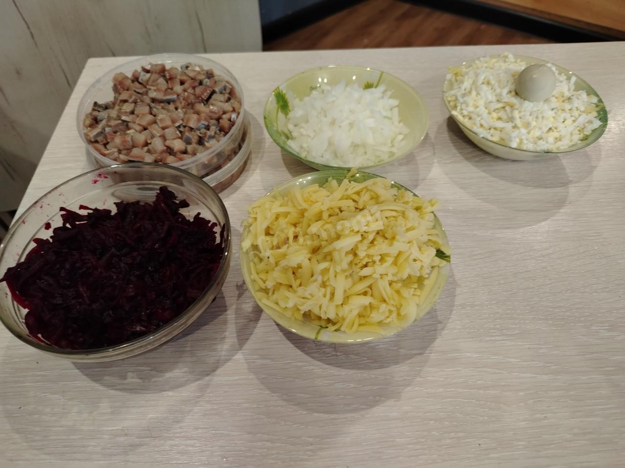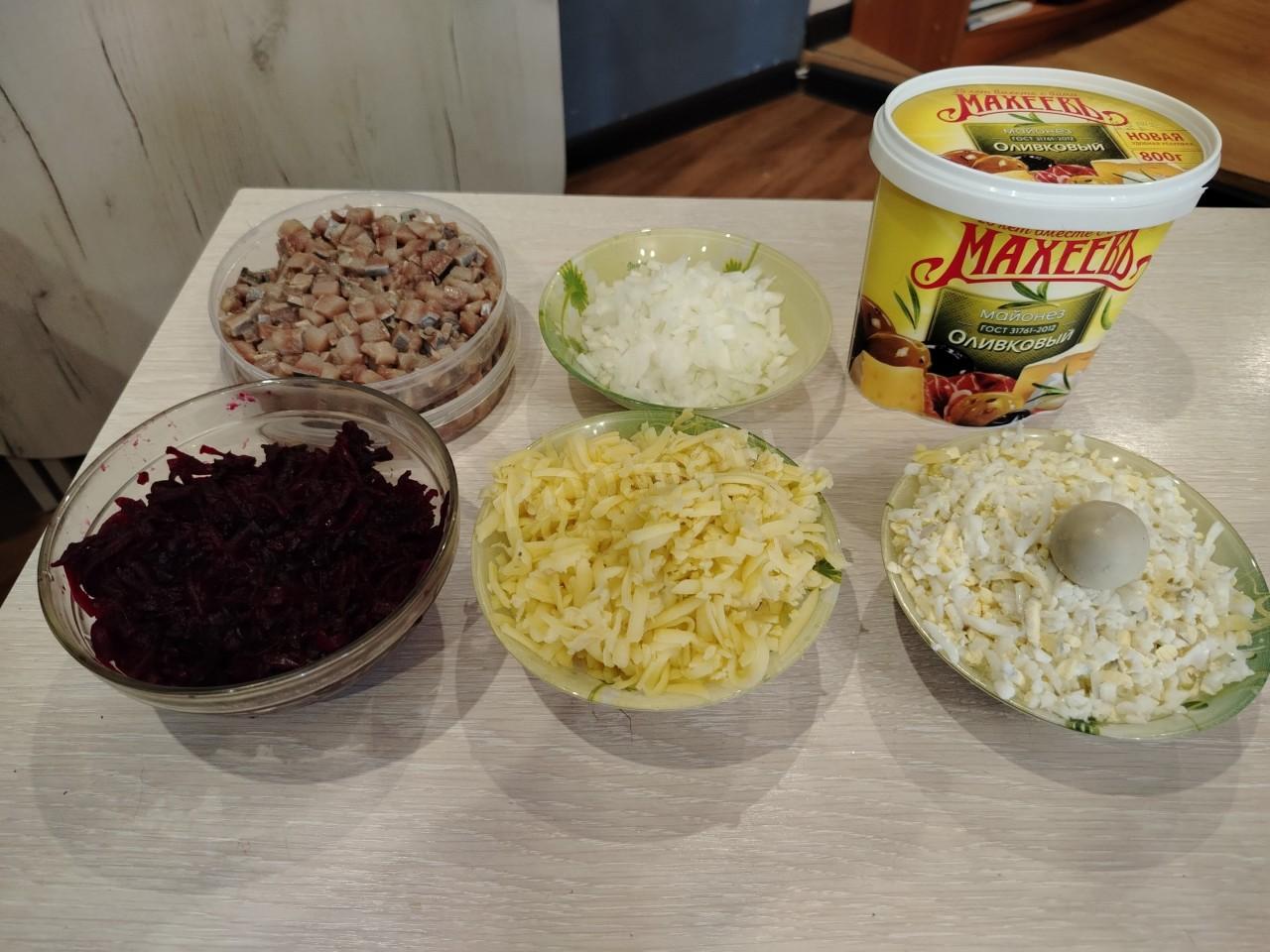 Подготовленные ингредиенты для вкусной селёдки под шубой)