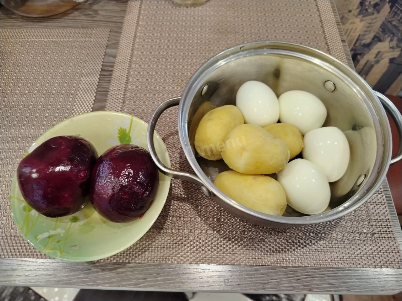 Вот ингредиенты которые понадобятся для приготовления праздничного салата. Варим яйца (после закипания 10 минут), картофель в мундире (20-25 минут), свёклу (50 минут).