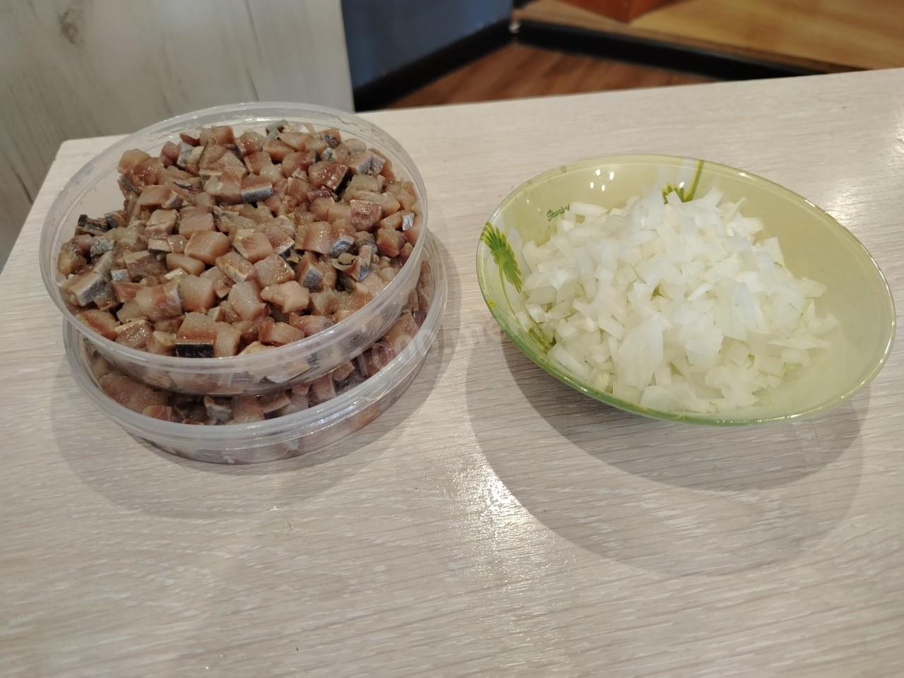 Режем селёдку кубиками со стороной примерно пять миллиметров. Мелко режем лук.