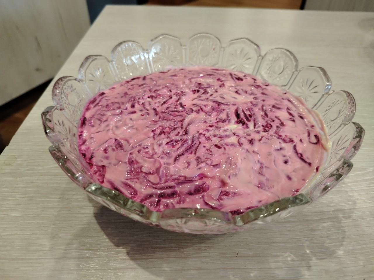 Потом ещё 1,5 ложки майонеза. Размазать так, чтобы он покраснел (не от трения, а от свёклы)), и опять чтобы было как можно меньше пустот.