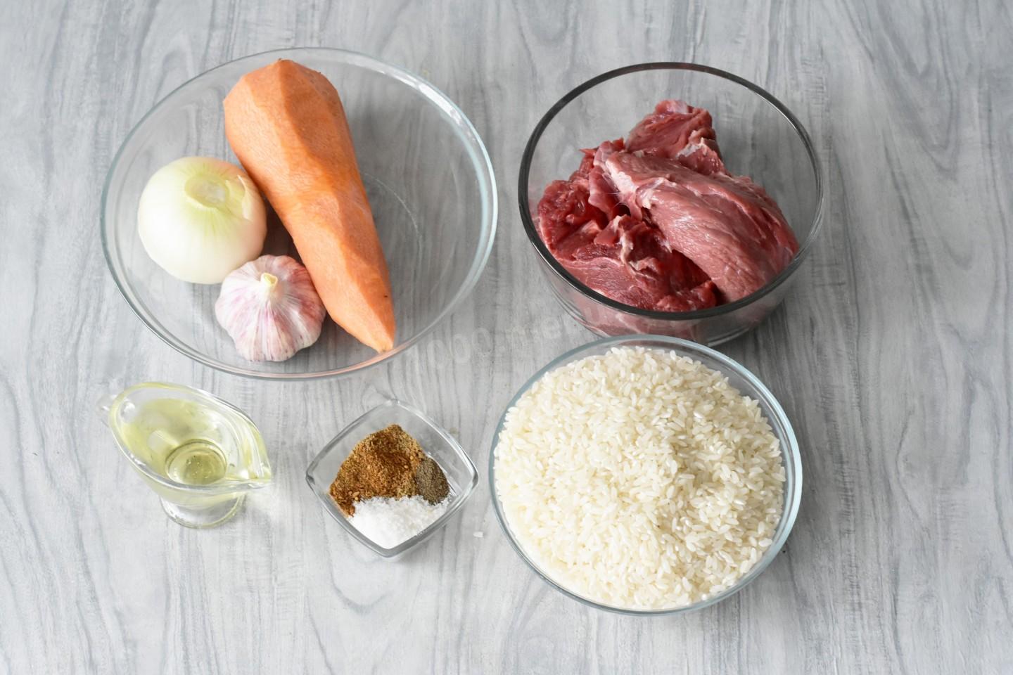 Как сделать плов в аэрогриле? Для начала подготовьте необходимые ингредиенты по списку. Специи для плова можете заменять и дополнять по своему вкусу. Какое мясо можно брать помимо говядины? Любое. Подойдет свинина, курица или индейка. Но при этом учитывайте, что изменится калорийность и время приготовления блюда.