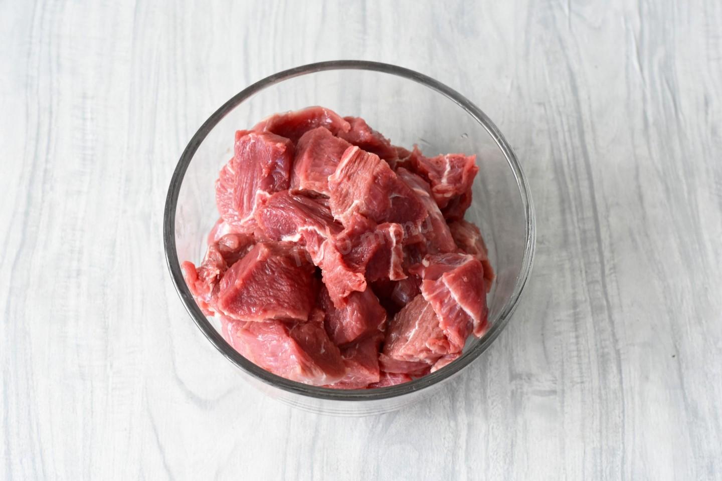 Говядину вымойте, обсушите и нарежьте средними кубиками.