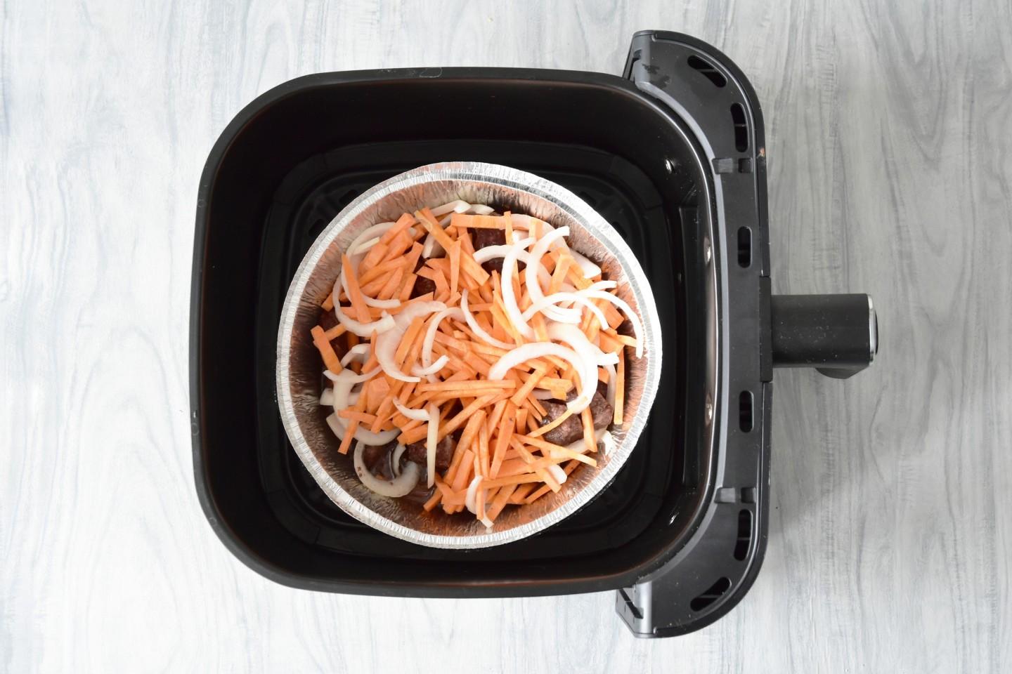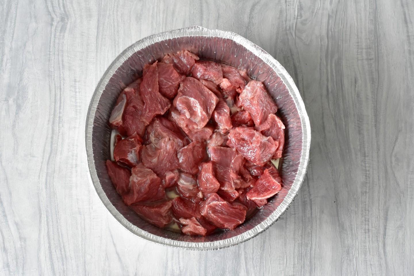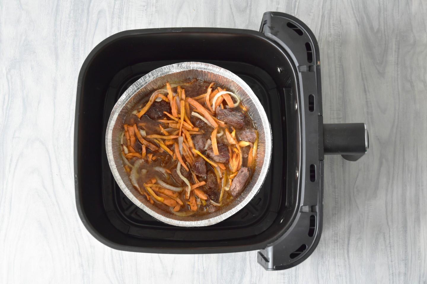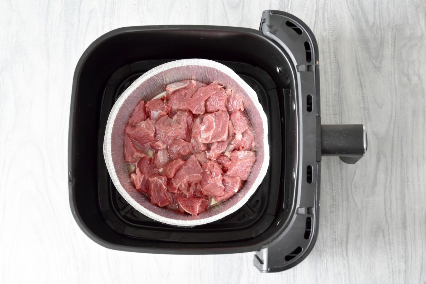 Включите аэрогриль разогреваться. Выставите 200℃. В глубокую форму объемом не менее 1,5 кг влейте часть растительного масла. Выложите говядину.