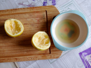 Затем лимон разрежьте пополам и выдавите из половинок сок. Удобнее делать это с помощью ручной или электрической соковыжималки.