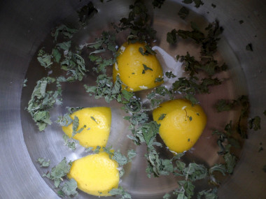 Мяту вымойте, обсушите. Снимите листики с веточек и порубите ножом, чтобы они пустили сок.