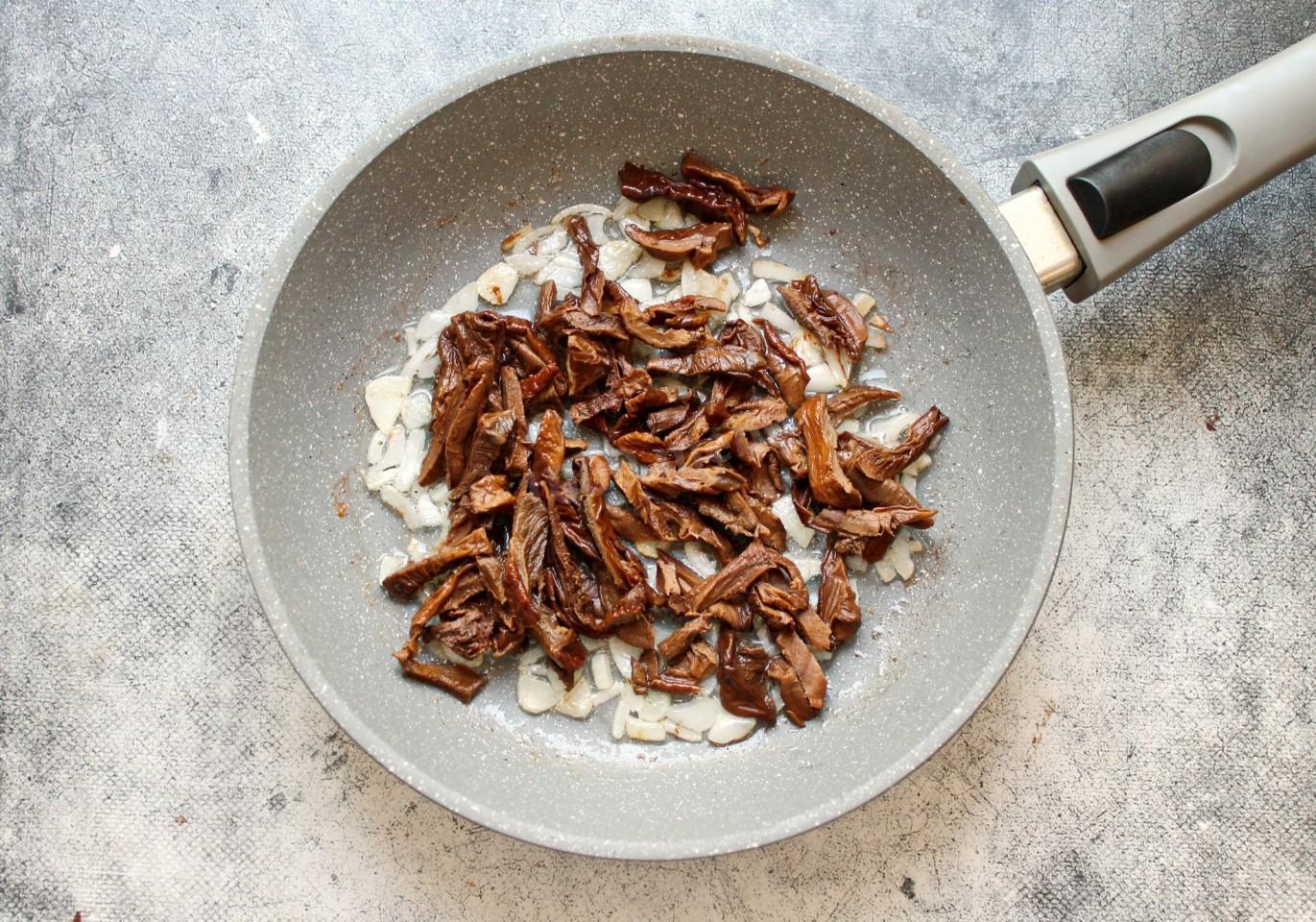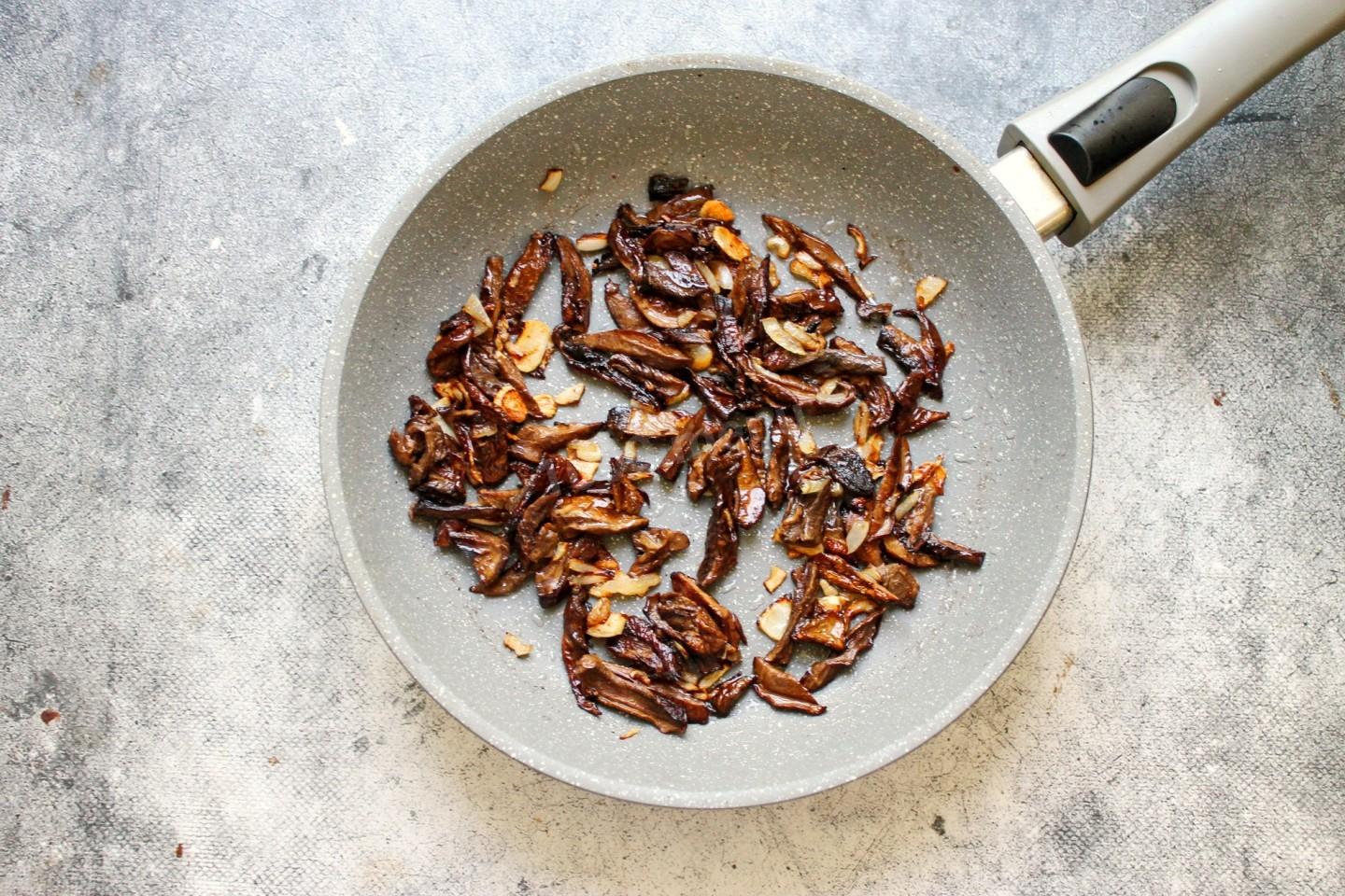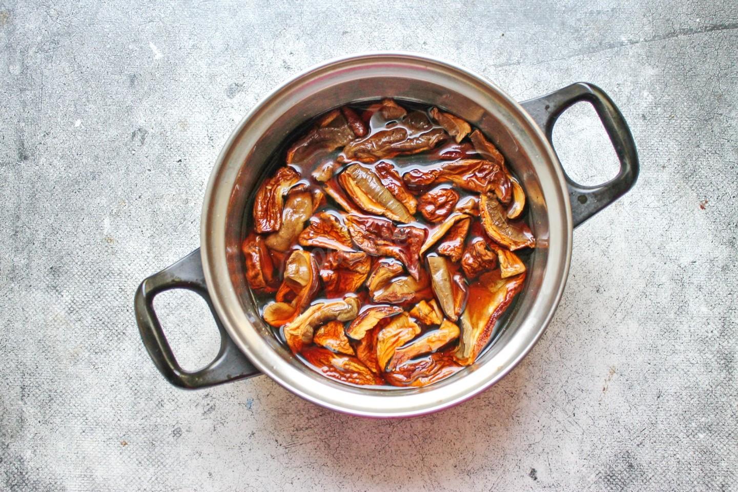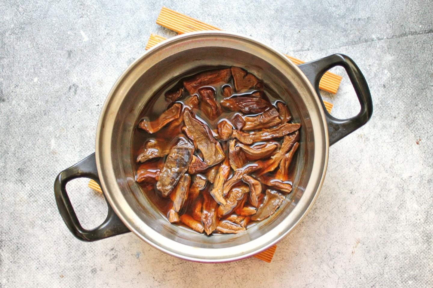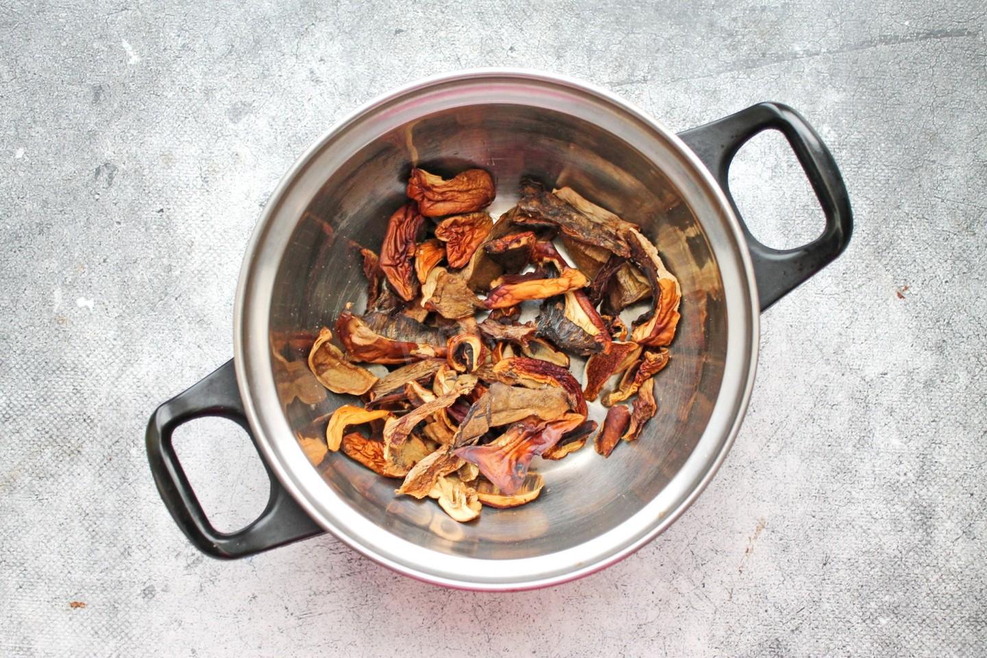 Залейте их 300 миллилитрами воды и оставьте для набухания на 3-4 часа или на всю ночь. Откиньте грибы на сито и дайте жидкости полностью стечь, в дальнейшем ее можно использовать для приготовления супа или соусов.