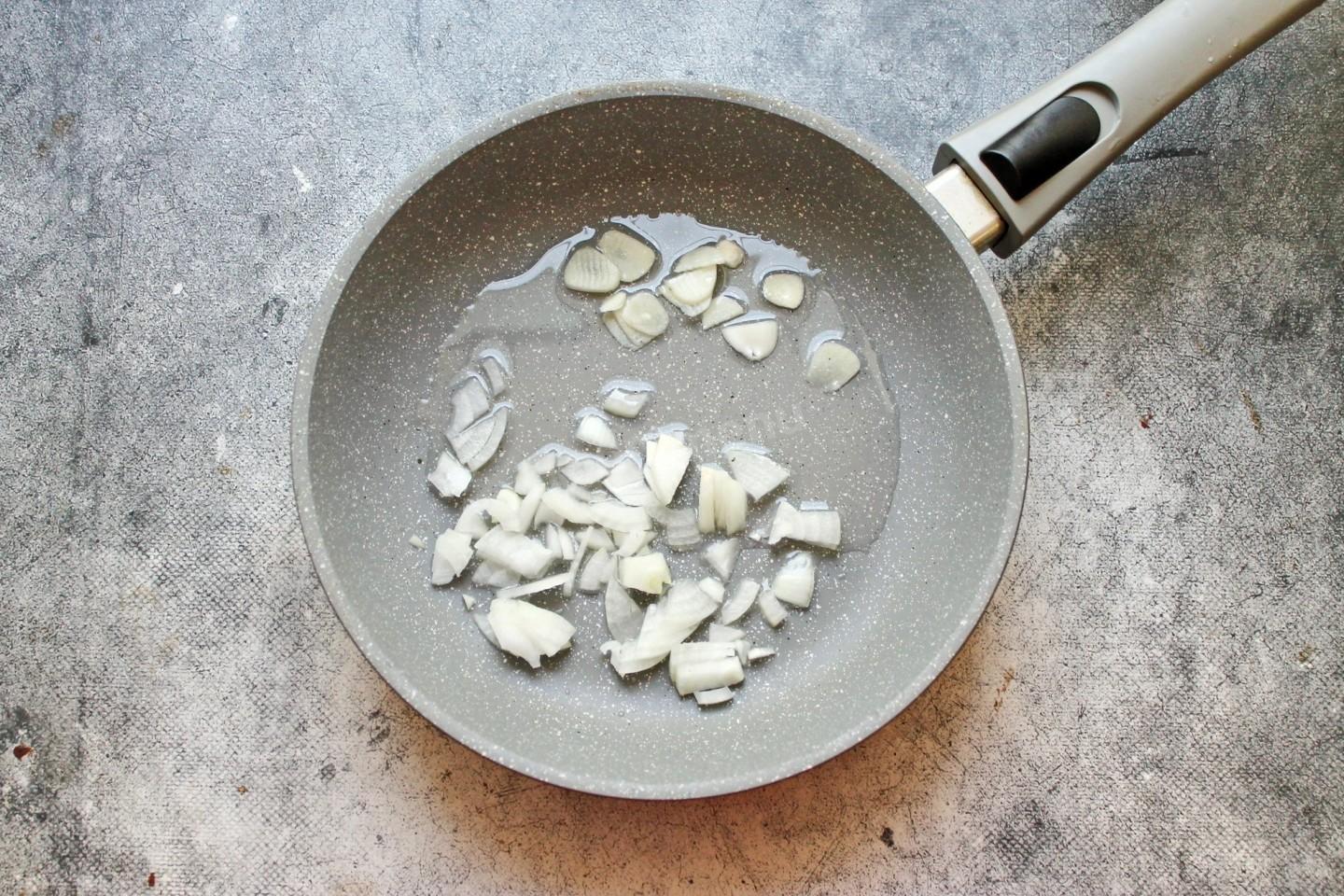 Репчатый лук и чеснок почистите, сполосните. Репчатый лук мелко порежьте, чеснок нарежьте пластинками. В сковороду налейте растительное масло и положите чеснок с луком. Обжаривайте овощи на среднем огне, перемешивая, в течение 3-4 минут. А какую сковороду взять для приготовления, и какое масло использовать, можно узнать под шагами ниже.