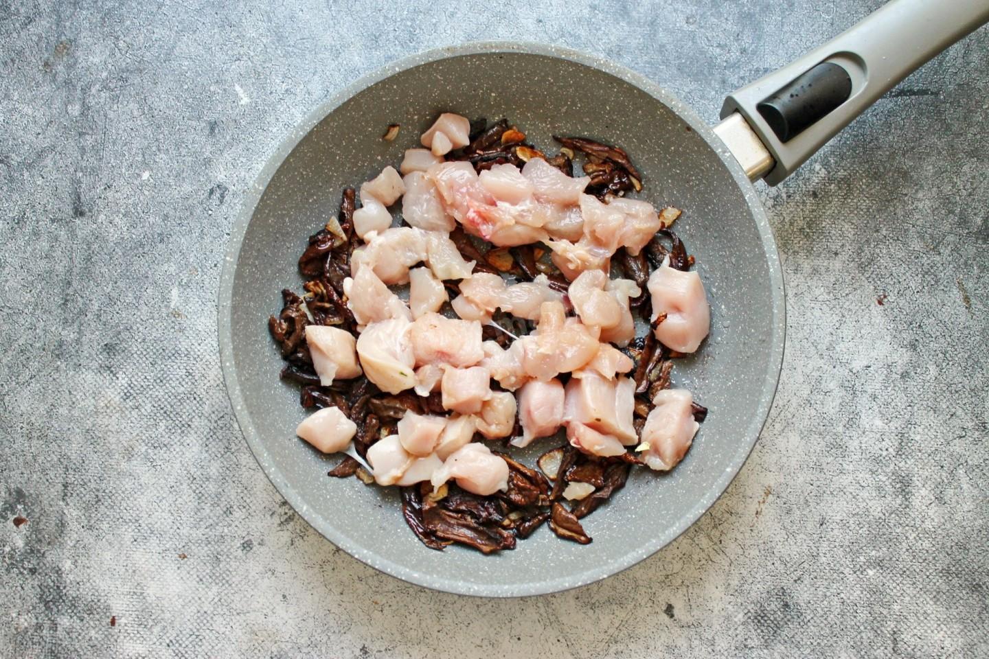 Куриное филе порежьте на кусочки и положите в сковороду. Обжаривайте все в течение 5-7 минут на среднем огне, перемешивая.