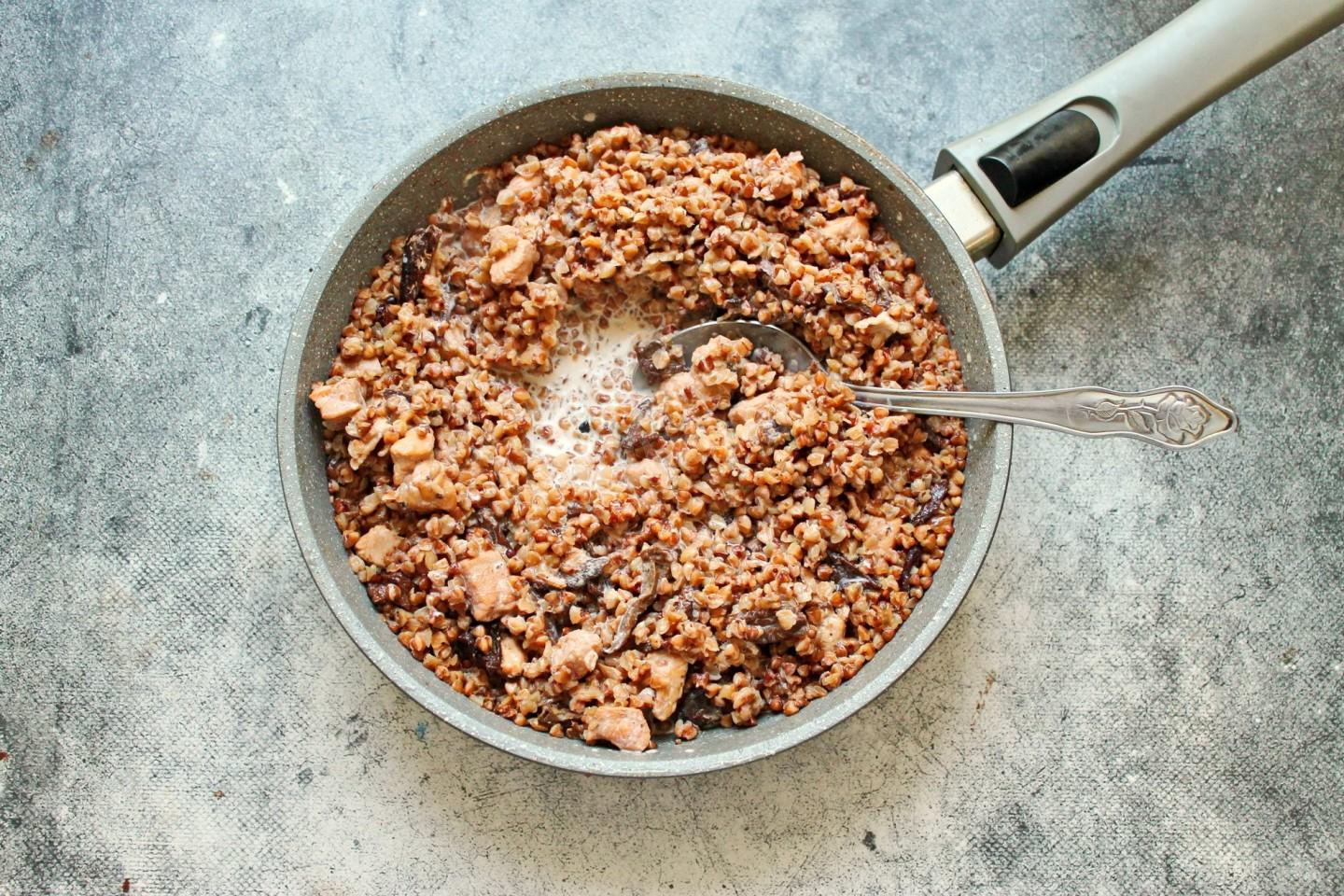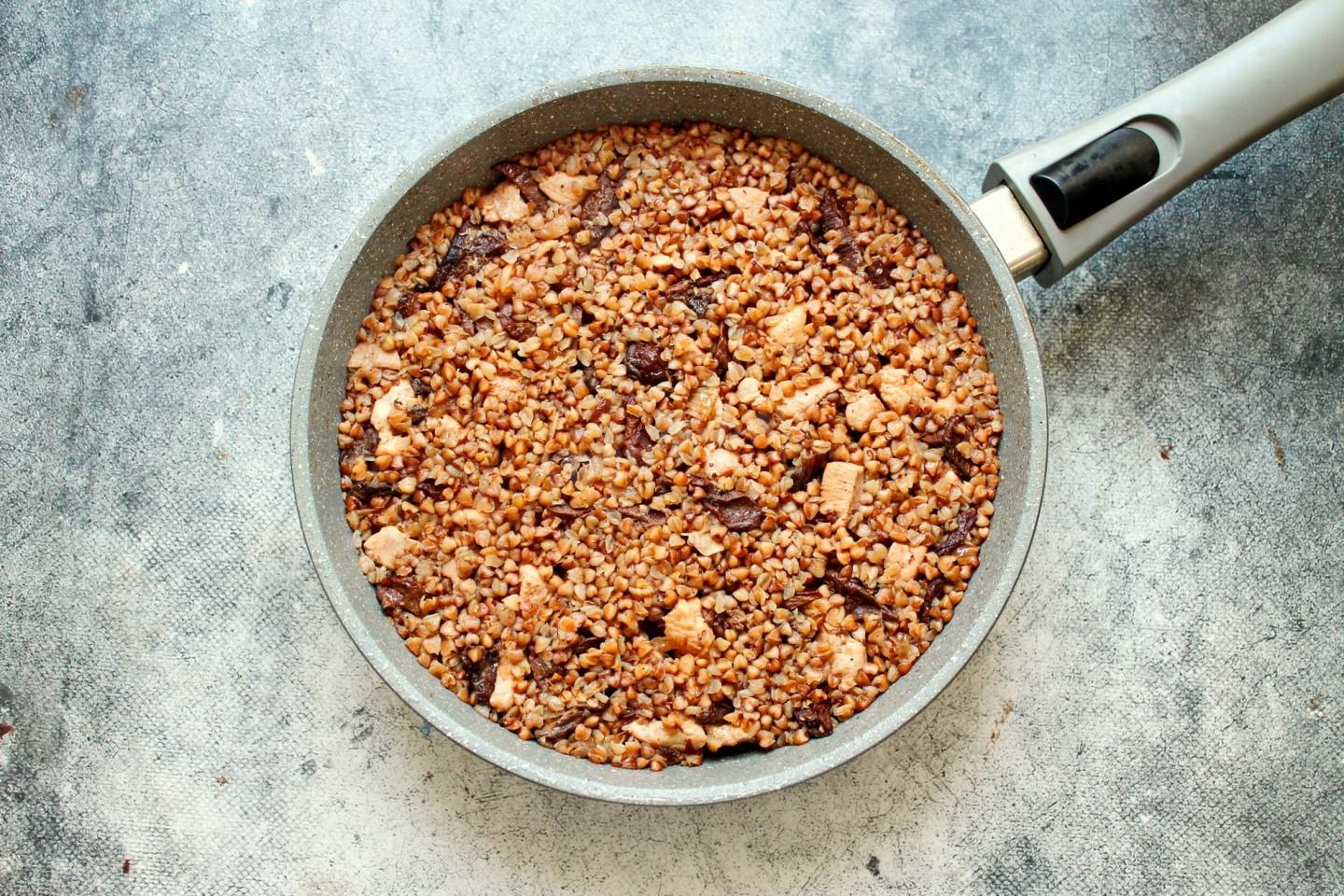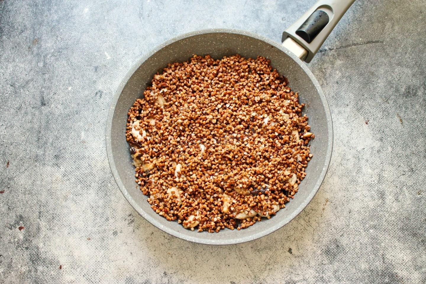 Гречку хорошо промойте, откиньте на сито и дайте воде полностью стечь. Переложите гречку в сковороду и распределите сверху. Как выбрать гречку и как правильно ее готовить, можно узнать в статье под рецептом.