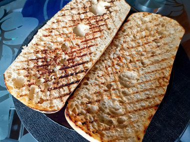 Подсушите каждую половинку на гриле или на сухой сковороде гриль до появления рисунка от сковороды. Но следите, чтобы хлеб не пересушился до состояния жесткого сухарика и не подгорел. Можете подрумянить бутерброд в конце, когда он будет уже с начинкой.