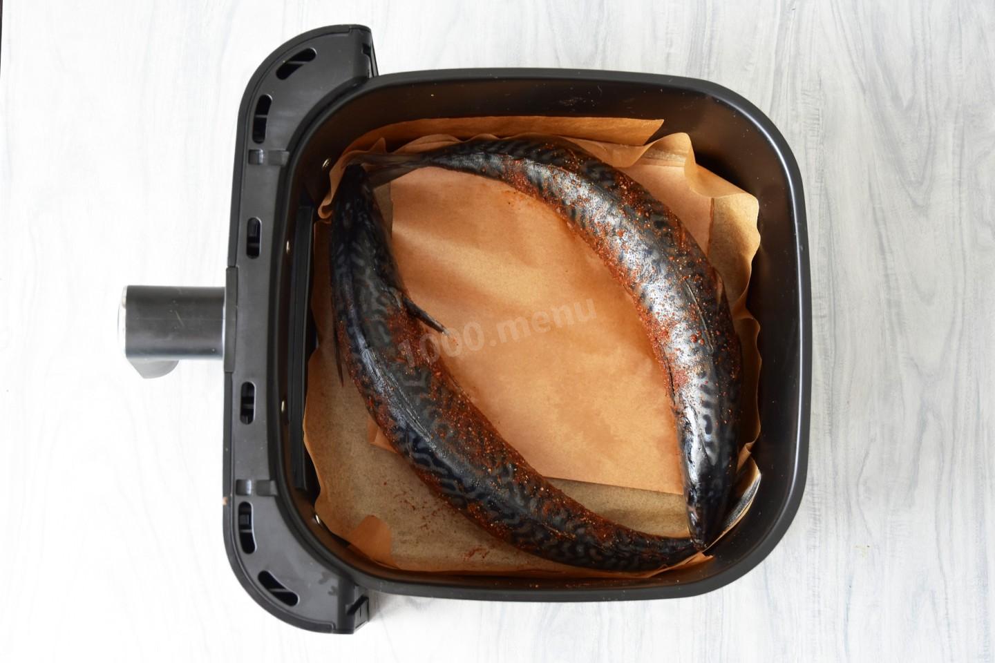 Включите аэрогриль разогреваться до 180℃. Решетку аэрогриля выстелите пергаментом и смажьте его растительным маслом. А лучше воспользуйтесь качественным силиконизированным пергаментом, к нему рыба не прилипнет. При запекании рыба выделяет жир, поэтому можно вообще обойтись без масла. С выбором пергамента поможет статья по ссылке в конце рецепта. Выложите скумбрию.