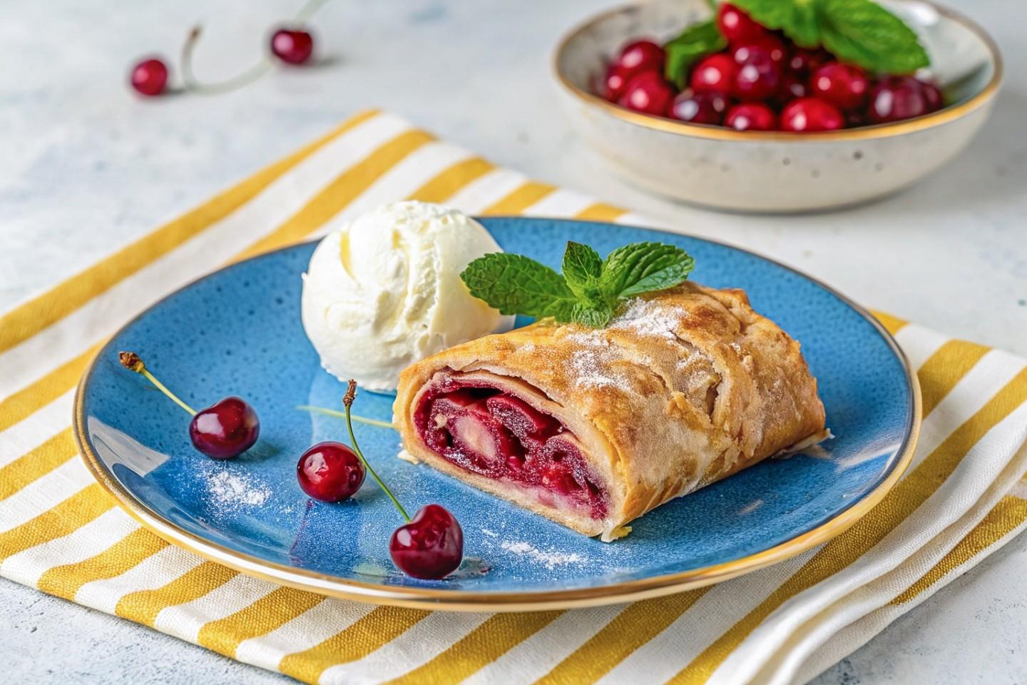Штрудель – традиционный австрийский десерт из тонкого слоёного теста с начинкой. Классический вариант готовится с яблоками, но вишнёвый штрудель не менее популярен. Тесто фило делает процесс приготовления быстрым и простым, а вишня придаёт десерту освежающий вкус.