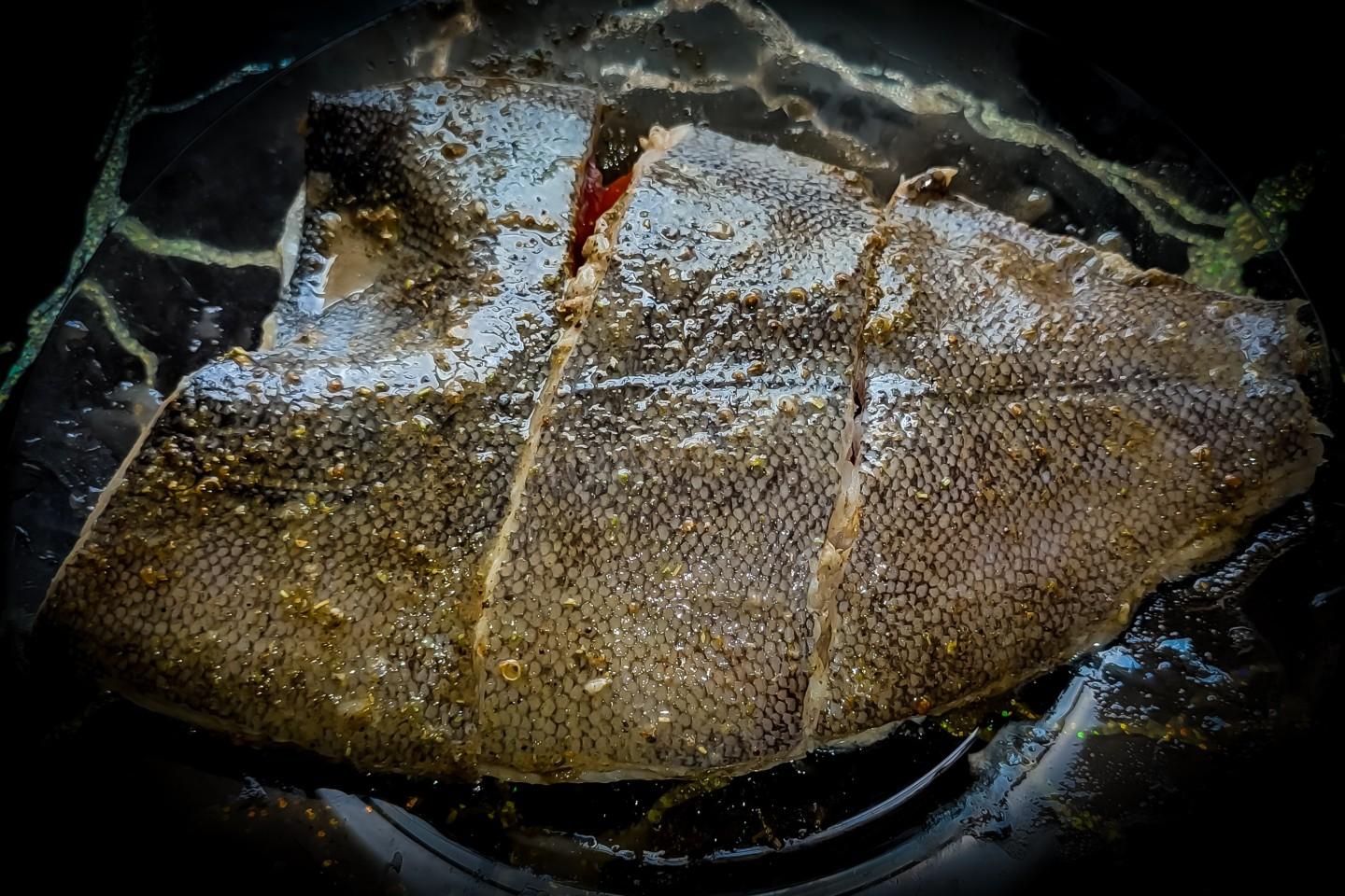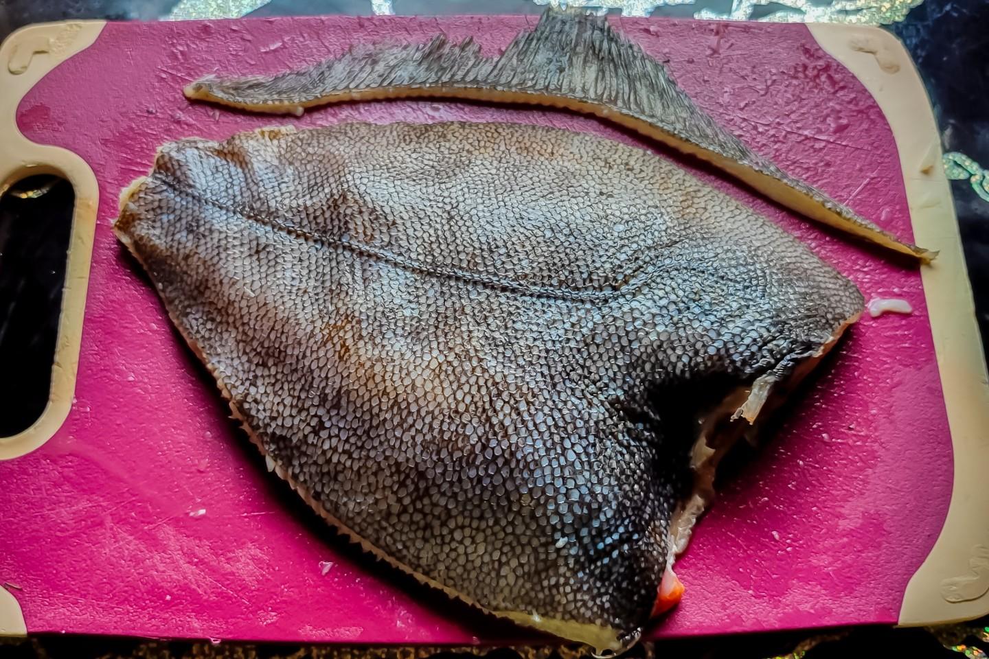 Пока специи настаиваются, займёмся рыбкой. Хорошо промыть под проточной водой, очистить чешую. Лично я кожу с камбалы не снимаю, но если Вы пожелаете, то это не трудно сделать. Ножом или ножницами срезать плавники и отрезать хвост.