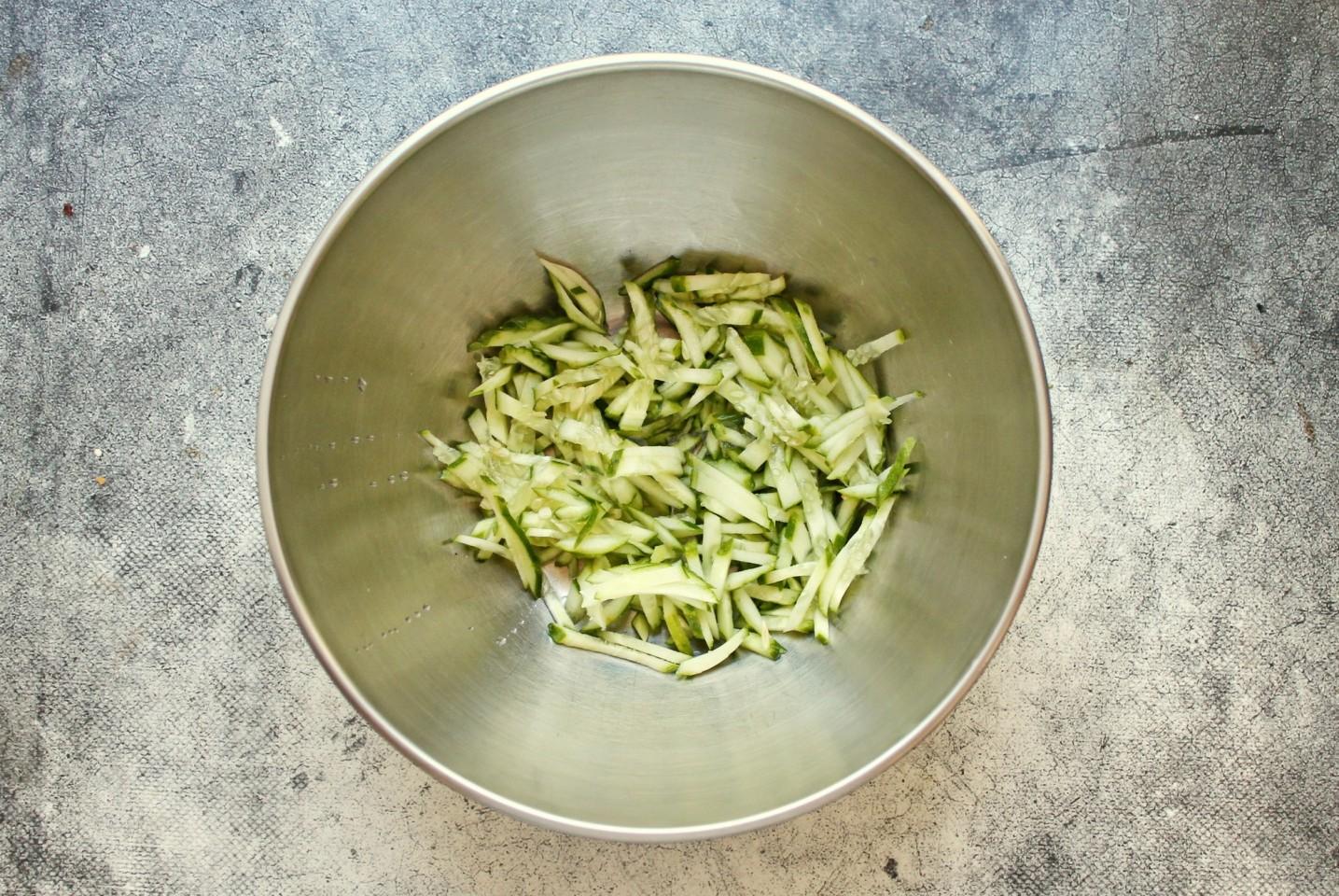 У огурца отрежьте кончики и порежьте тонкой соломкой, положите в салатник. Если у огурцов грубая и жесткая кожура, ее лучше очистить.