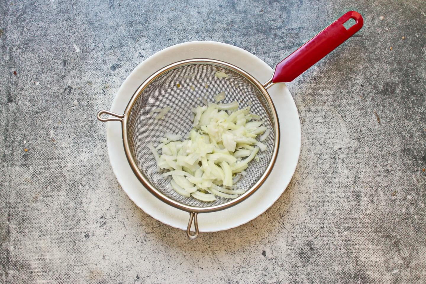 Репчатый лук почистите и порежьте тонкими полукольцами. Положите лук в миску и залейте кипятком на 2-3 минуты. Ошпаренный лук откиньте на сито, дайте воде стечь и полностью остудите. Если не любите такой лук, его можно замариновать или заменить на зеленый.