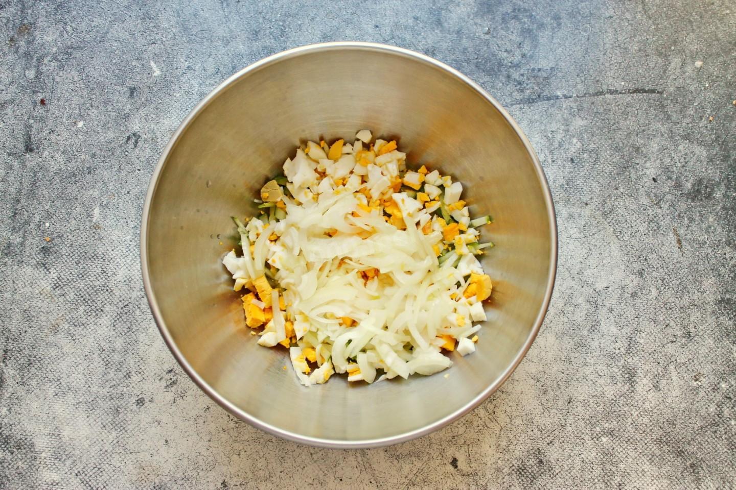 Добавьте в салатник ошпаренный лук.